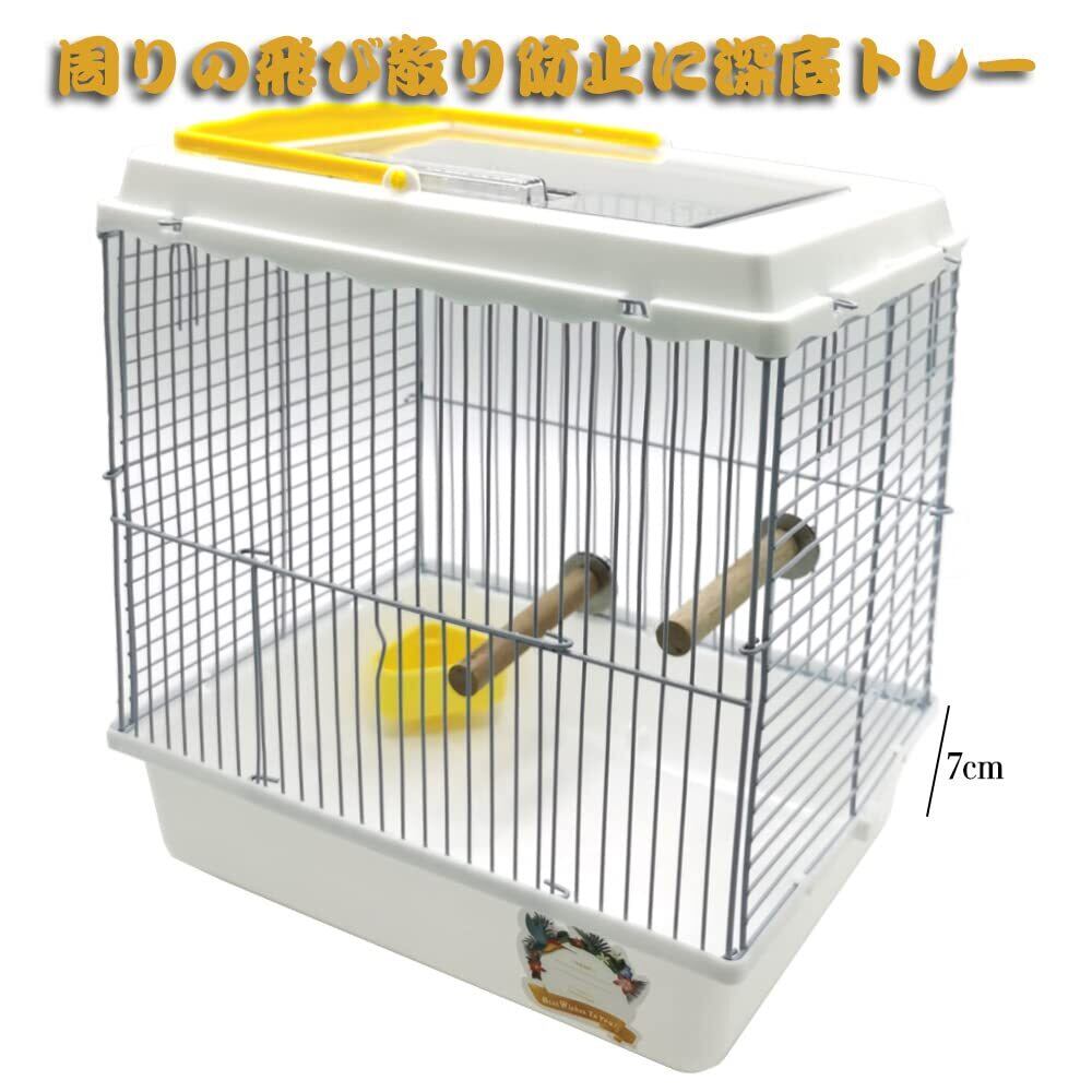 周りの飛び散らり防止に。エサや脂粉などの飛び散りを軽減する7cm深底トレーを採用しているのが特徴。爽やかなホワイトカラーが小鳥の美しさを引き立てます。