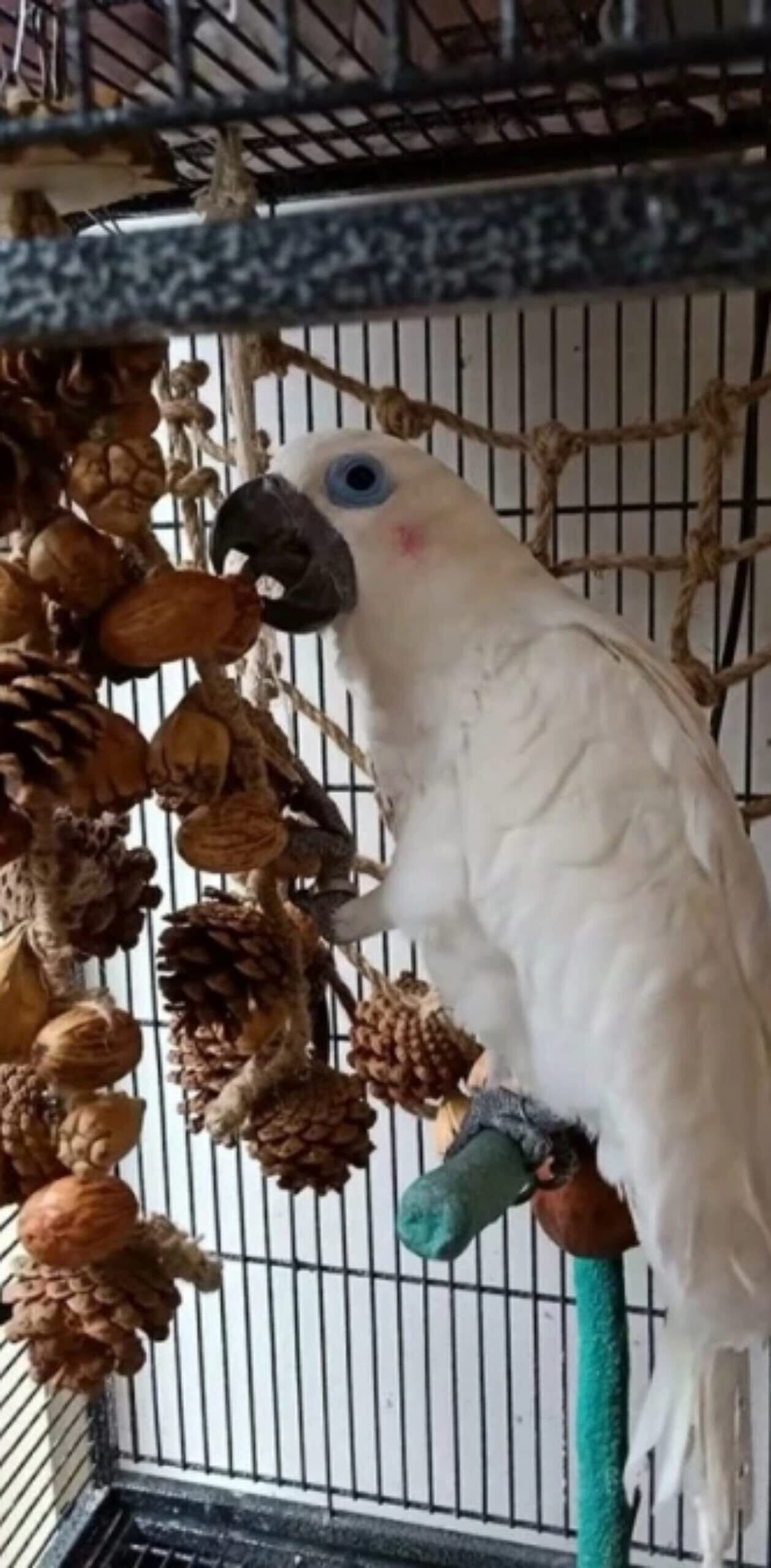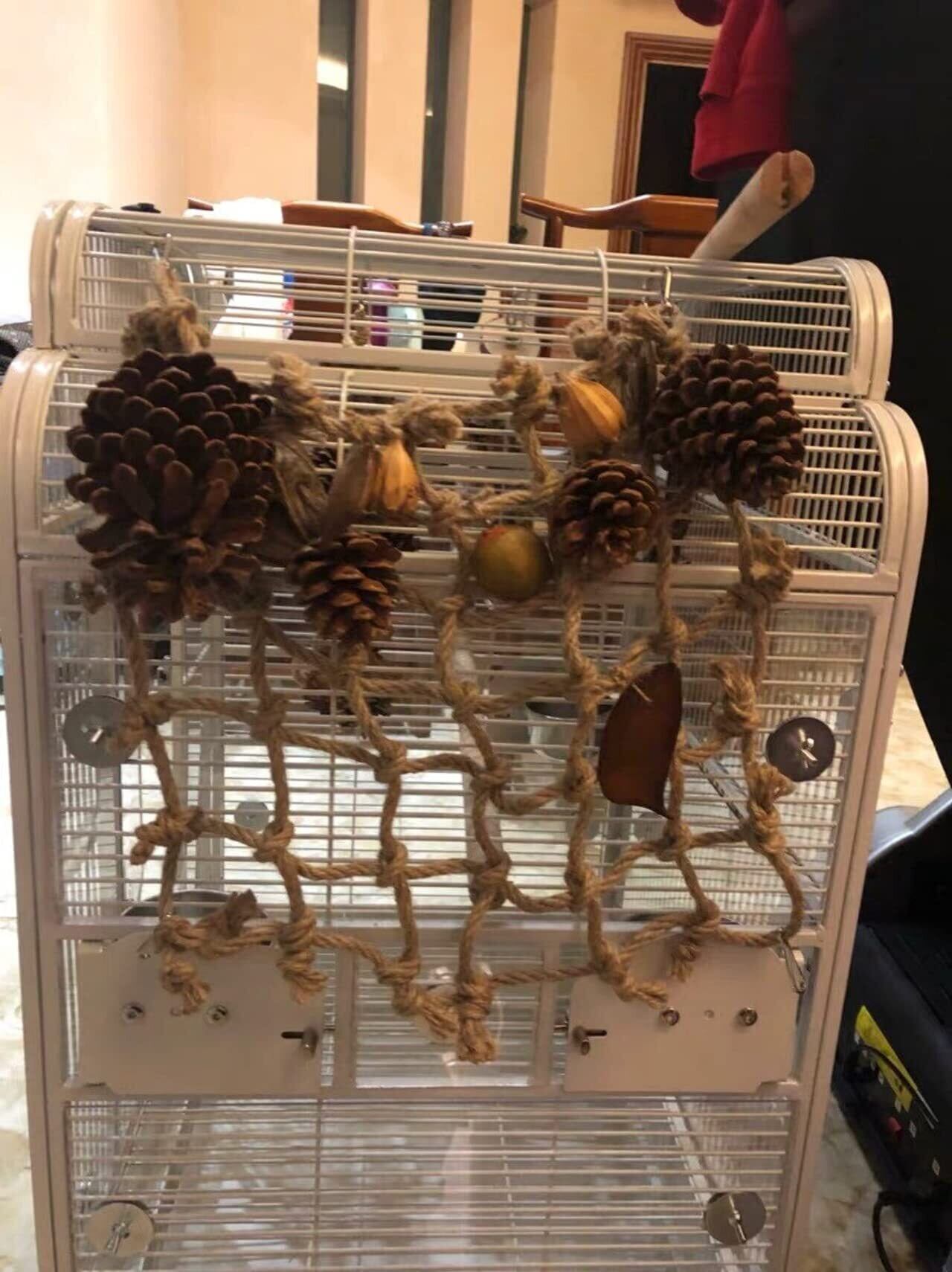 よじ登ったり、吊り下げブランコの様にぶら下がったり、通り抜けたり、かじったり、クライミングネット1つで色んな遊びができるバードトイです。