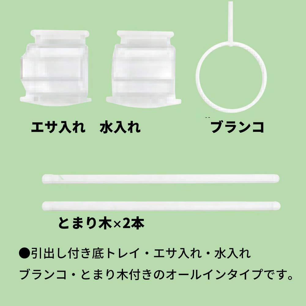 ケージフェンス:スチール、トレイ本体:PP、底トレイ:PP、とまり木:PVC、エサ入れ・水入れ:PP、ブランコ:PP