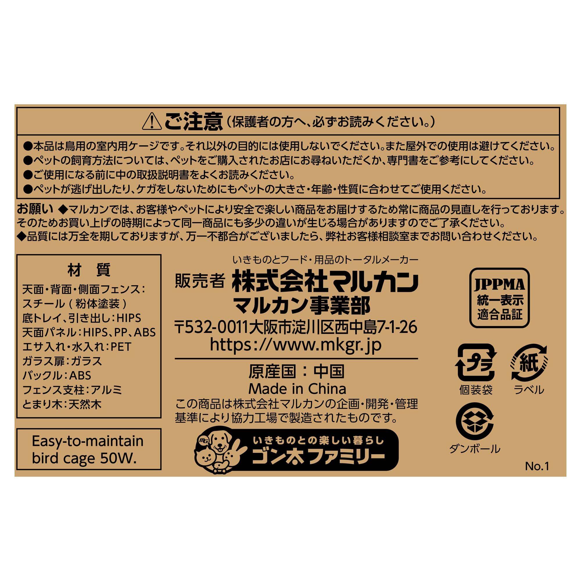 ミニマルランド バードパレス クリアライフ 50W フルオープン片面扉 お掃除ラクラク 組み立て簡単 ワイド約50cm 鳥用