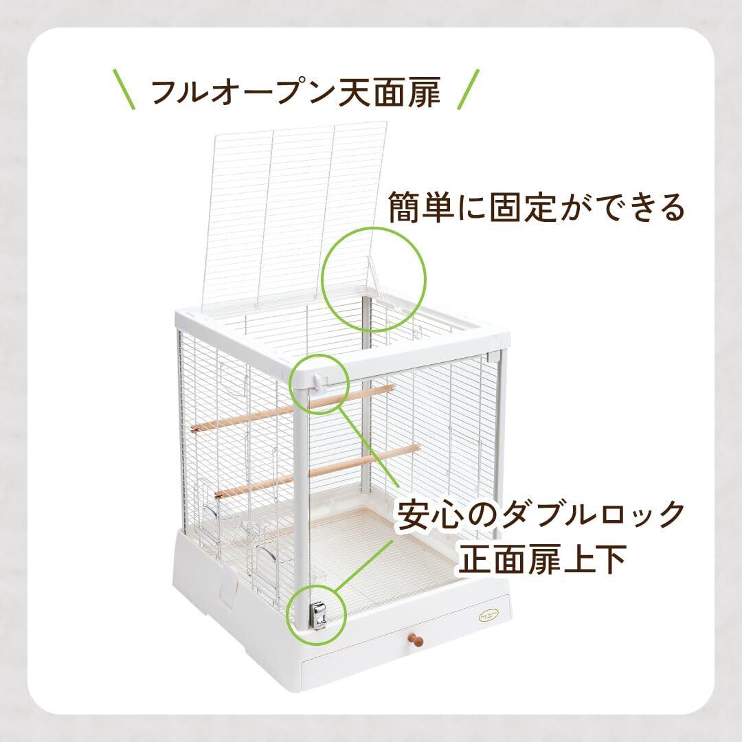 【正面扉フルオープン】扉が大きく開くため、お世話がしやすく、インコとのふれあいが深まります。