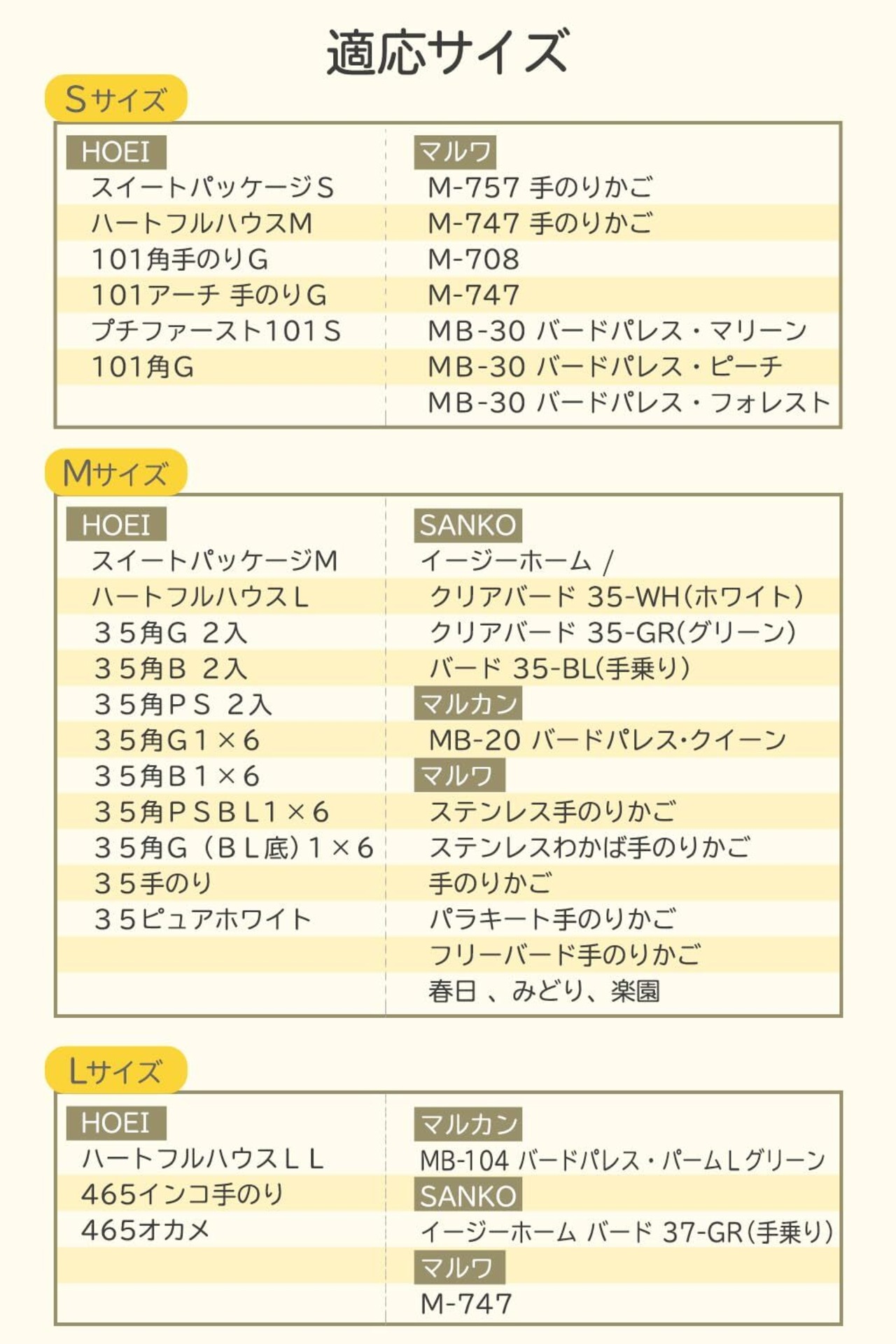 【サイズが豊富】HOEI(ホーエイ)を始め、マルワやSANKOなど、様々なケージに対応しています。 適合サイズをお確かめの上お買い求めください。 本製品サイズ S: 幅36cm 奥行31cm 高さ37cm、M: 幅38cm 奥行42cm 高さ45cm、L : 幅46cm 奥行 47cm 高さ52cm