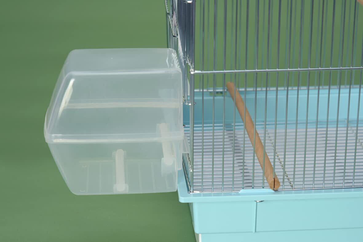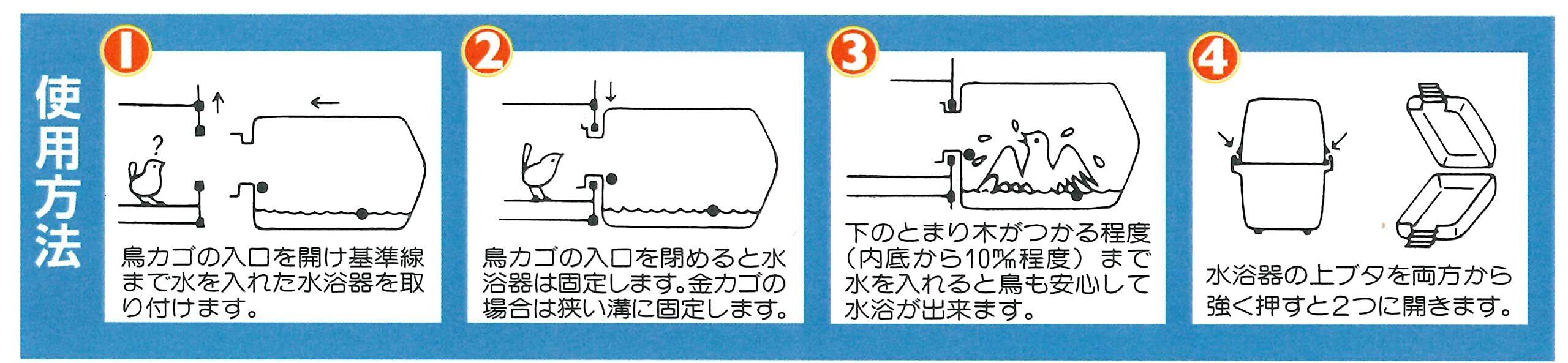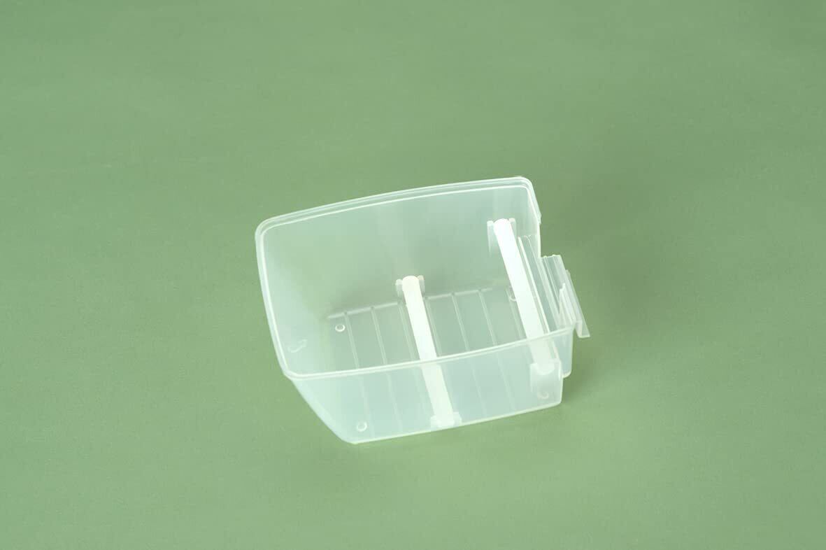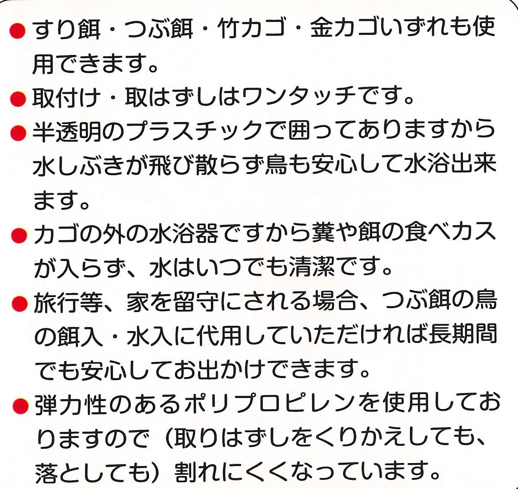 本品は水浴び器、餌入れ兼用で、すり餌・つぶ餌・竹カゴ・金カゴ、どれも使用できます。 取り付けはワンタッチです。半透明のフード付きで、水しぶきが飛び散らず鳥も安心して水浴びできます。 外付けの水浴び器なのでフンや食べカスが入らず、水はいつも清潔です。 本体は弾力性のあるポリプロピレン製で割れにくくなってます。