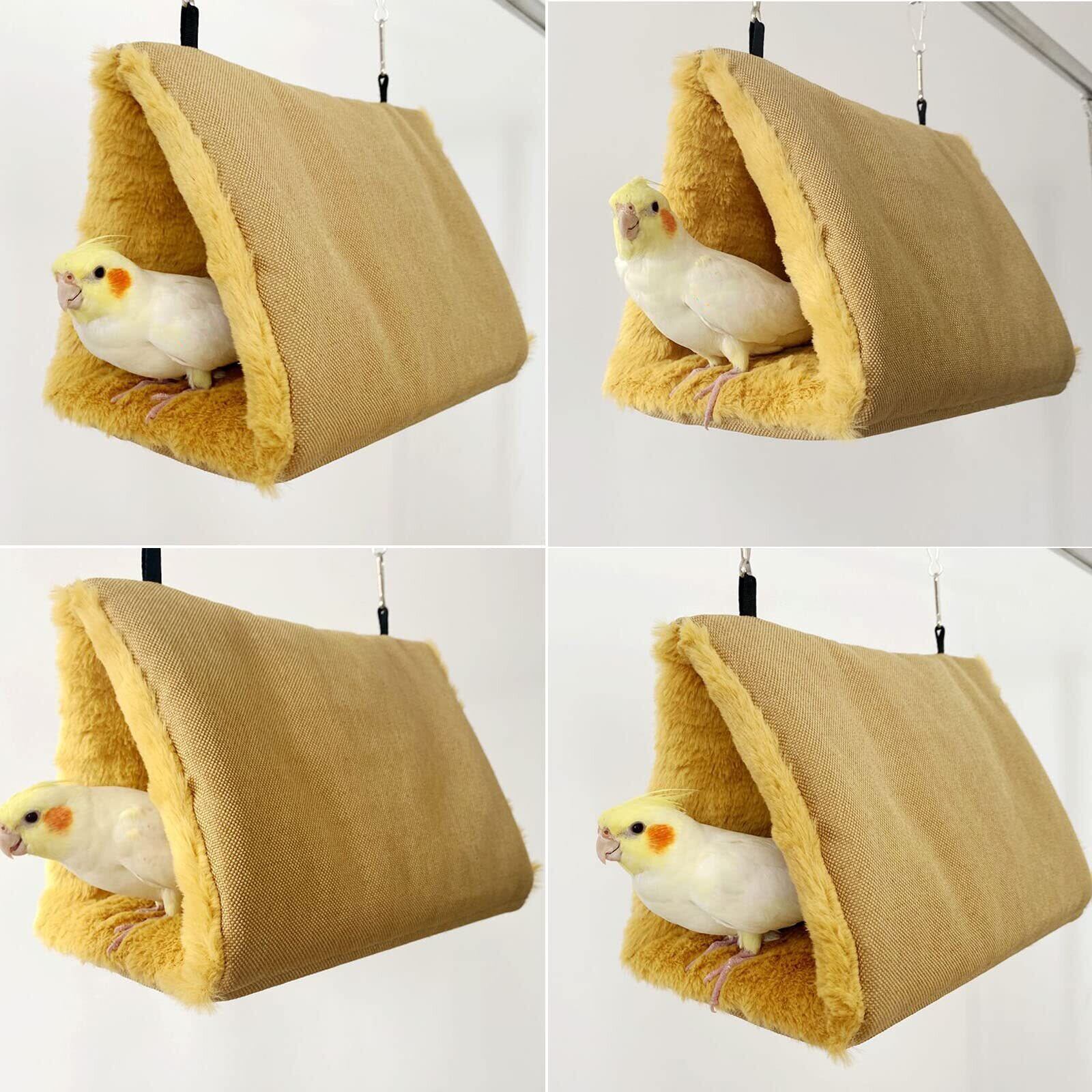 Hakona 鳥たちの寝床 三角ハウス インコ おもちゃ 掛ける鳥の巣 ハンモック ペット 用 テント いんこおもちゃ かわいい 寝袋 無地 厚みふわふわ 暖かい Cave Bed 遊び場 保温 寒さ対策 鳥の おもちゃ 鳥用品 文鳥 鸚鵡 小動物 ハウス 冬 フックとチェーン付き 両側開放型-S イエロー