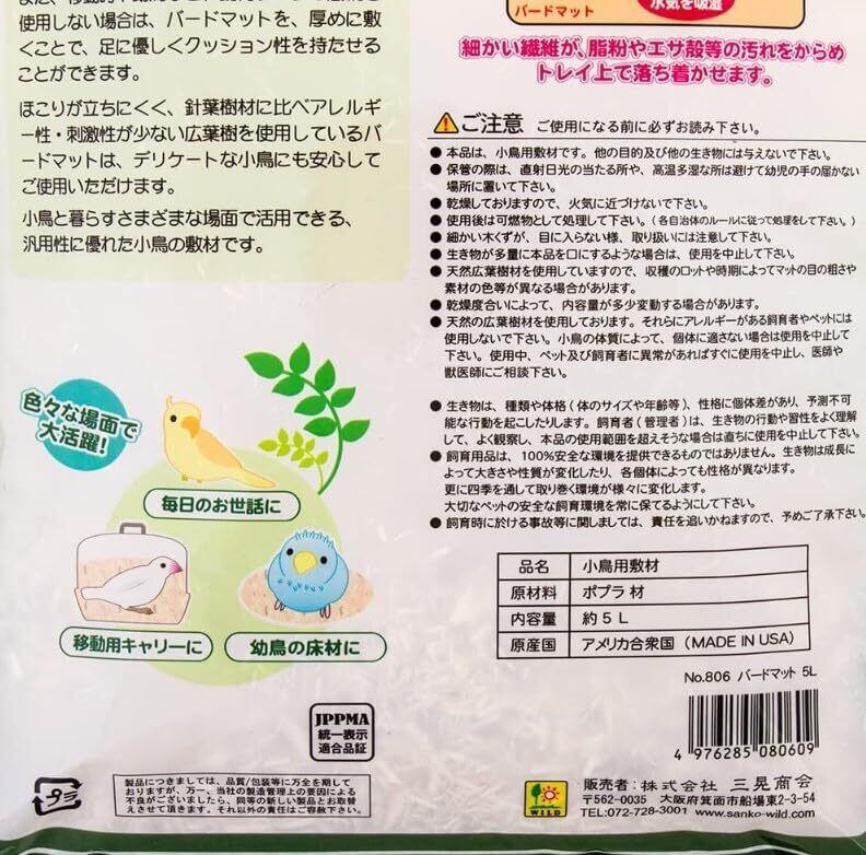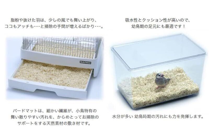 4個セット バードマットは、細かい繊維が、小鳥特有の 舞い散りやすい汚れを、からめとってお掃除の サポートをする天然素材の敷き材です。 細かい繊維が、抜け落ちた羽、糞やエサ殻を優しくからめて、日々のお掃除の手間を軽減。 吸水性・吸臭性に優れ、軟便や多尿の小鳥にもオススメです。 針葉樹に比べ、ホコリが立ちにくくアレルギー性・刺激が少ない広葉樹を使用しています。