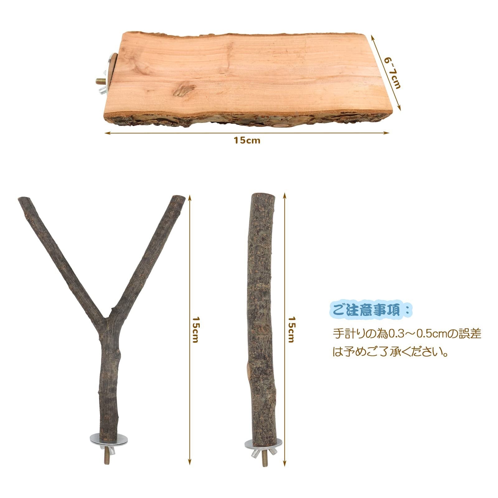 サイズ:止まり台:幅6-7cm、長さ15cm、Y型止まり木:長さ15cm、枝の直径は1.5-2.5cm(太い部分)です。I型止まり木:長さ15cm、枝の直径は1.5-2.5㎝です。