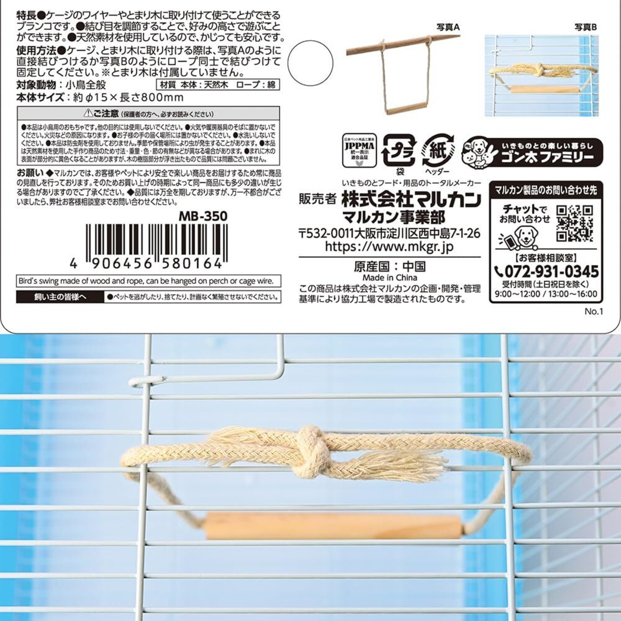 ・ケージのワイヤーやとまり木に取り付けて使うことができるブランコです。 ・結び目を調整することで、好みの高さで遊ぶことができます。 ・天然素材を使用しているので、かじっても安心です。