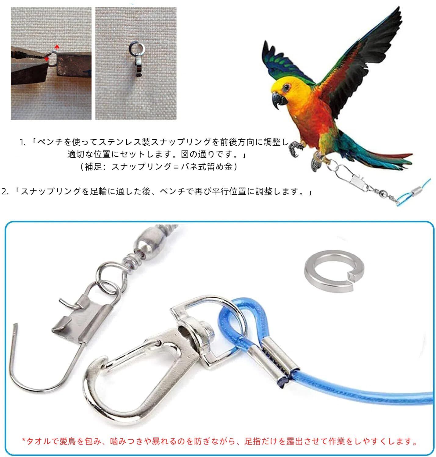 【セット内容】フライングロープ1本、足輪1個、取付用リング2個。ほとんどの鳥種に対応可能です。