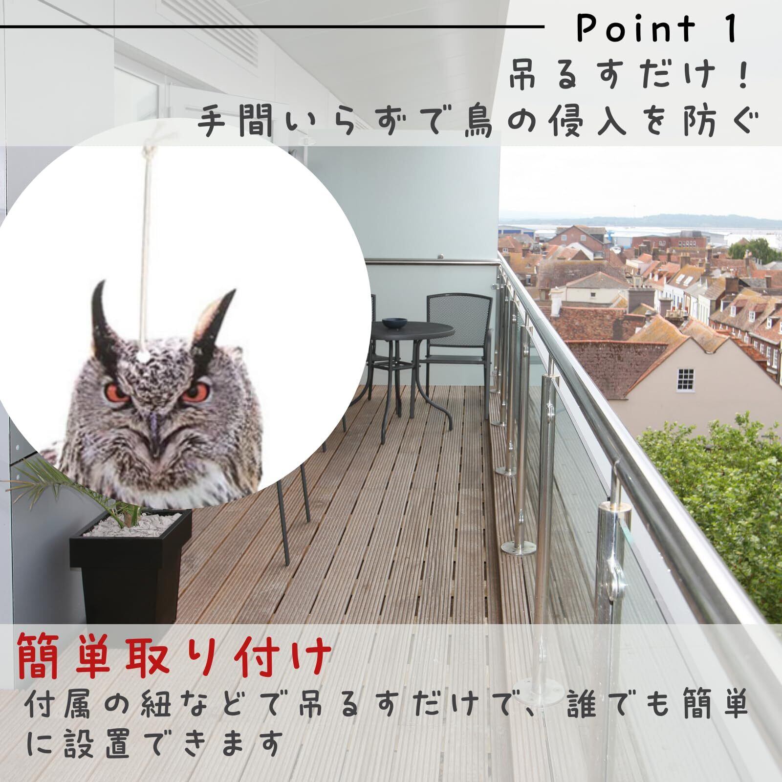 【簡単取り付け】ミミズク上部のフックにひもやロープで好きな場所に吊るすだけ。工具不要、簡単に取り付けられます。風を受けることで首や羽が揺れ、よりリアルな動きで鳥を警戒させます。