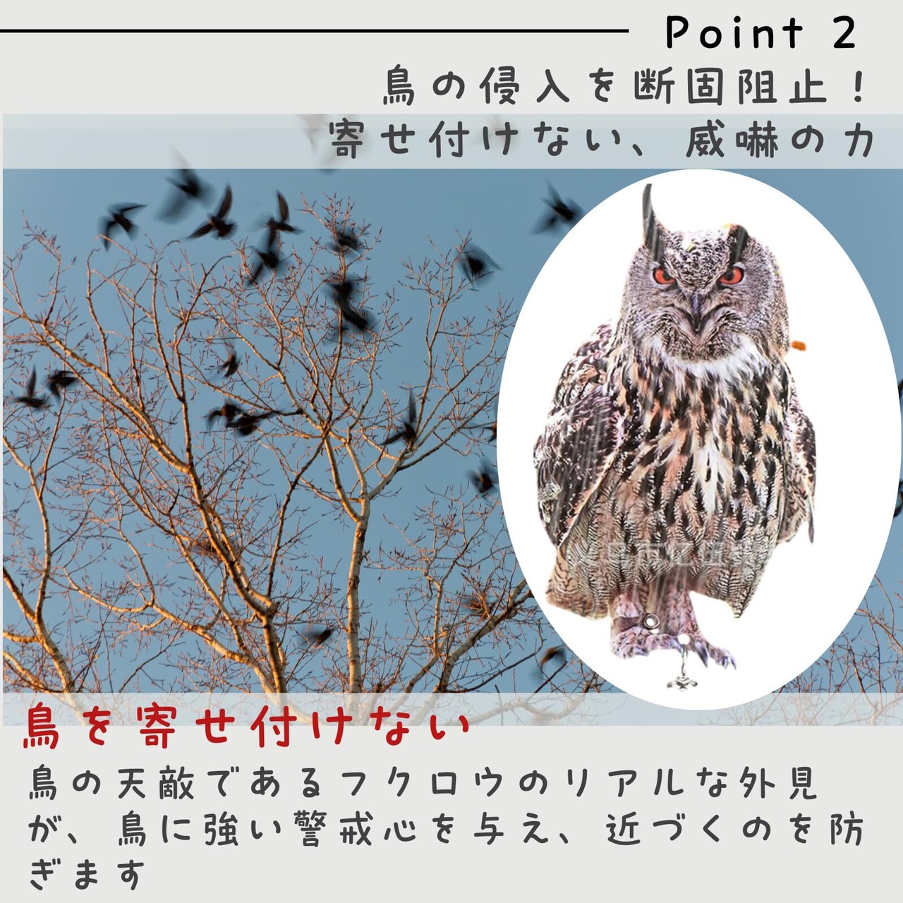 【高クオリティー】リアルなサイズ感とビジュアルです。本物そっくりのミミズクのデザインが、カラス、ハト、スズメなどの鳥を効果的に威嚇し、寄せ付けません。