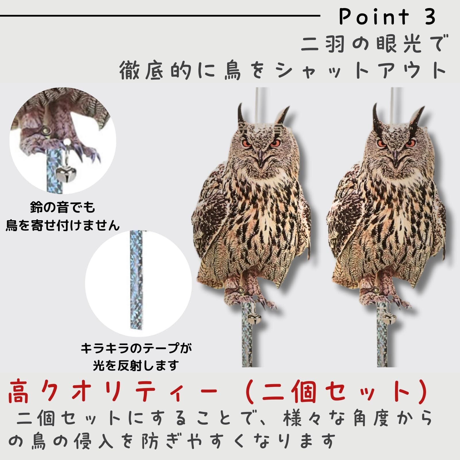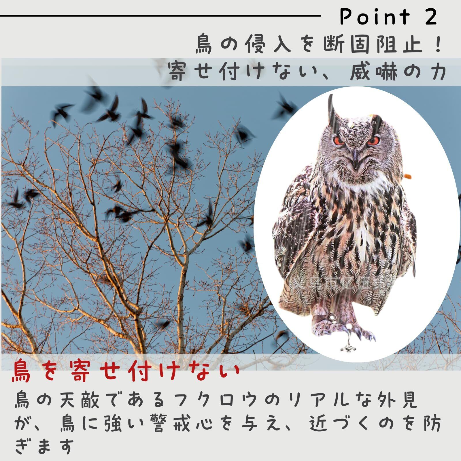 【十分な鳥よけ】鳥が苦手な不規則な動きと光の高反射、鈴の音で防鳥効果がアップ。カラス、鳩、ムクドリなどの防鳥、鳥獣、フン害対策ができる便利グッズ。 耐候性のある素材を使用しているので、屋外でも長期間使用できます。リアルなミミズクの造形は、庭やベランダの景観を損ねることなく、鳥害対策ができます。