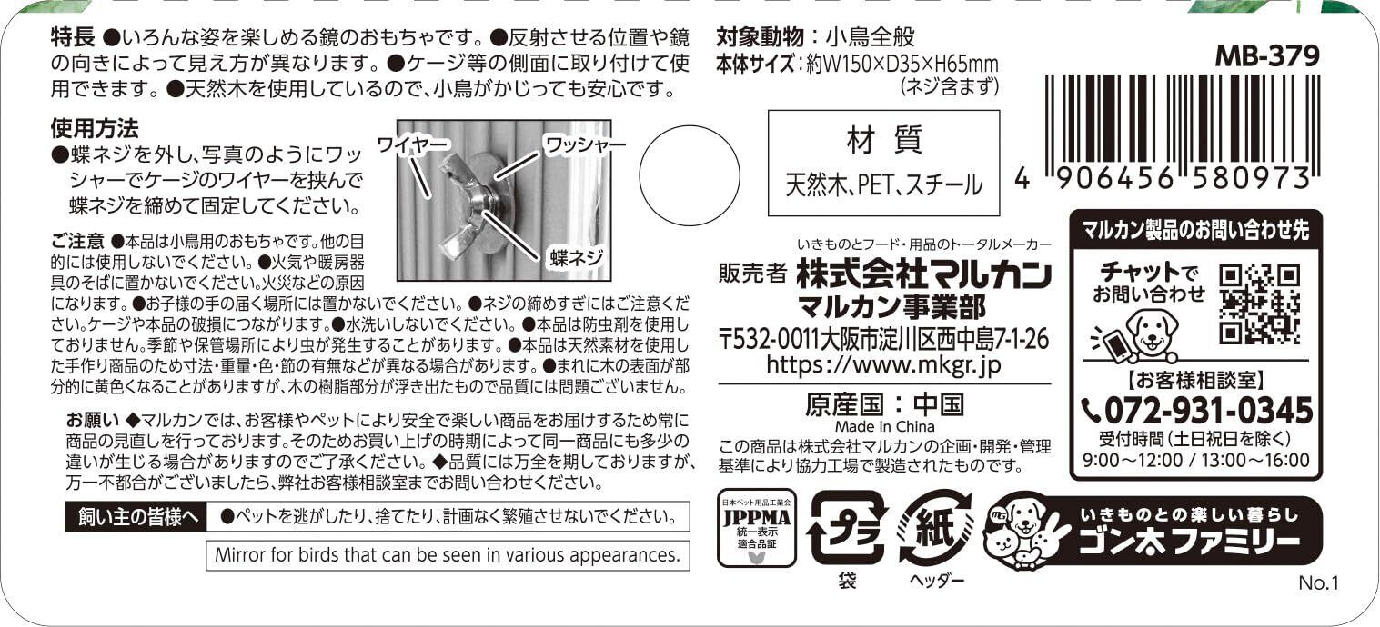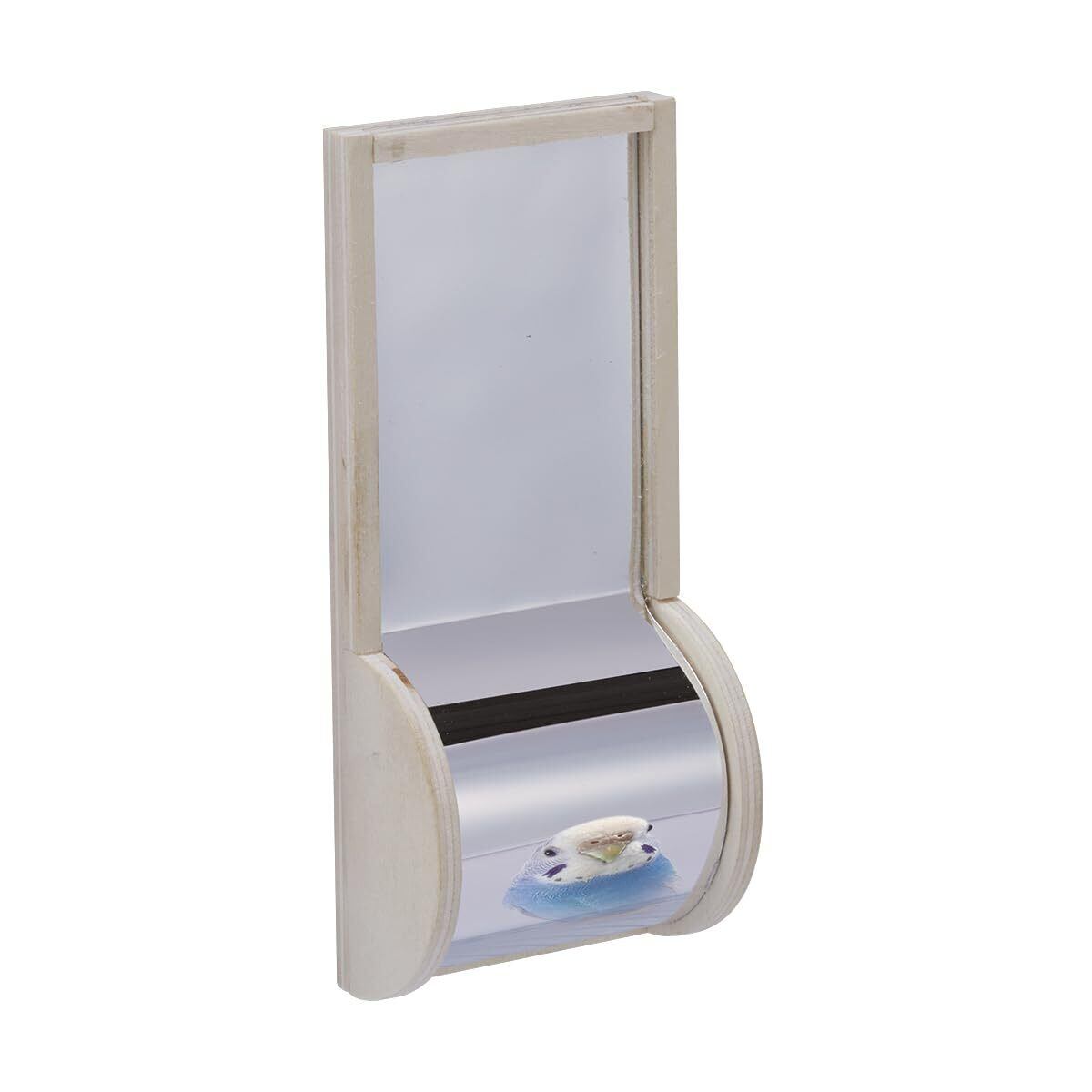 ・小鳥がいろいろな姿を楽しめる鏡のおもちゃです。 ・反射させる位置や鏡の向きによって見え方が異なります。 ・ケージ等の側面に取り付けて使用できます。 ・天然木を使用しているので、小鳥がかじっても安心です。