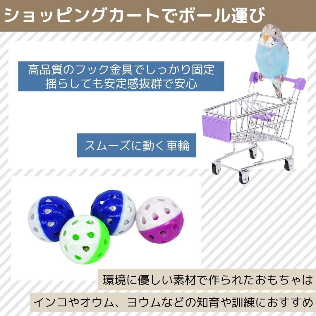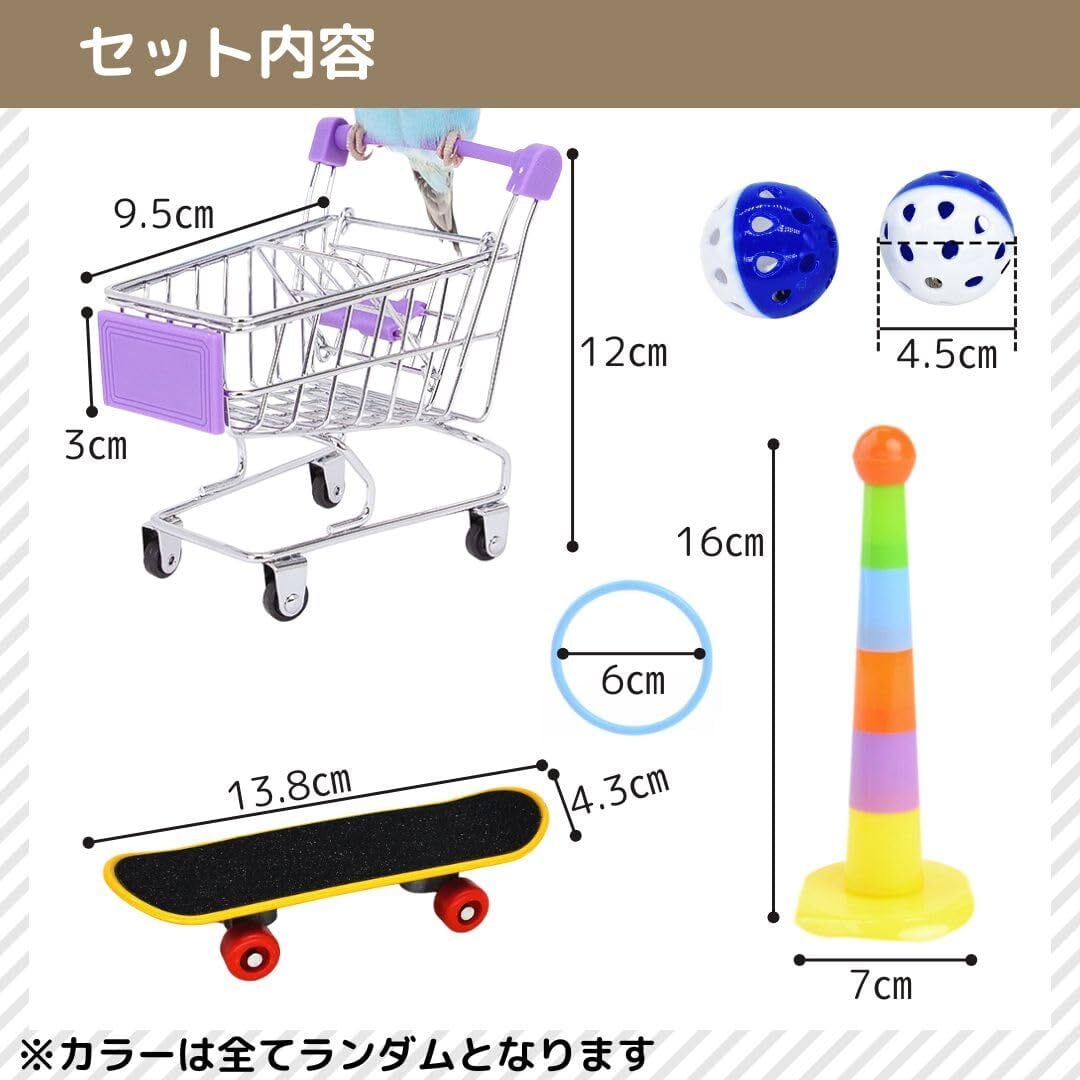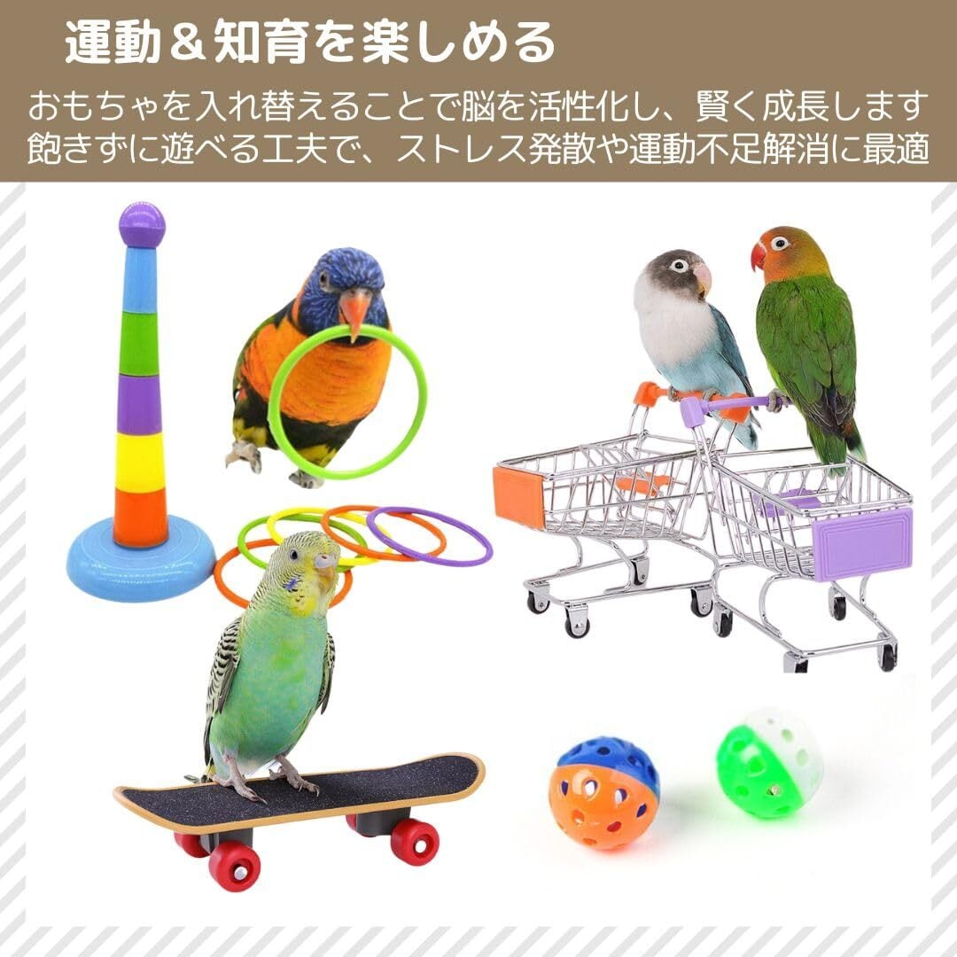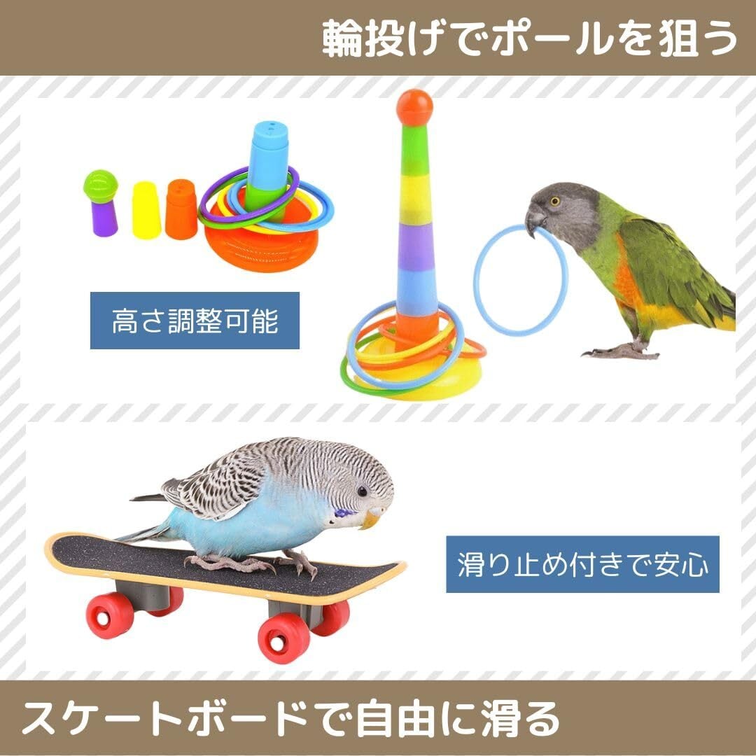 【本格的な動きで小鳥も夢中】ショッピングカートでボールを運び、スケートボードで自由に滑り、輪投げでポールを狙う!それぞれのアイテムが動きのある遊びを提供します。車輪はスムーズに動き、スケボーには滑り止め付きで安心。輪投げは高さ調整可能で、飼い主と一緒に遊べる設計です。可愛い小鳥の姿を見ながら楽しいひとときを過ごせます。ペットの健康と楽しさを両立するおもちゃセットです。