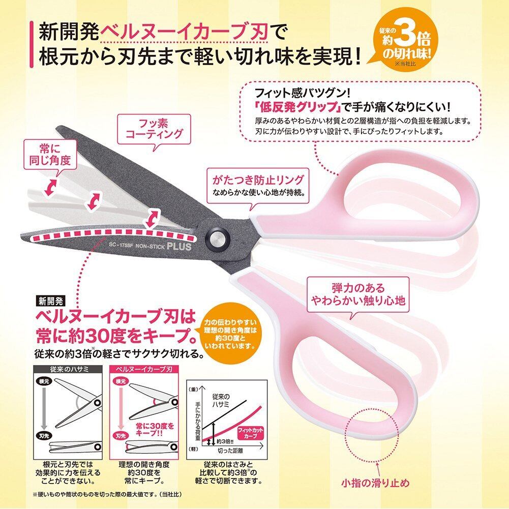 プラス はさみ フィットカットカーブ フッ素コート 低反発グリップ 粘着テープ のり ベタつかない 30度 SC-175SF ホワイト/グレー 34-515