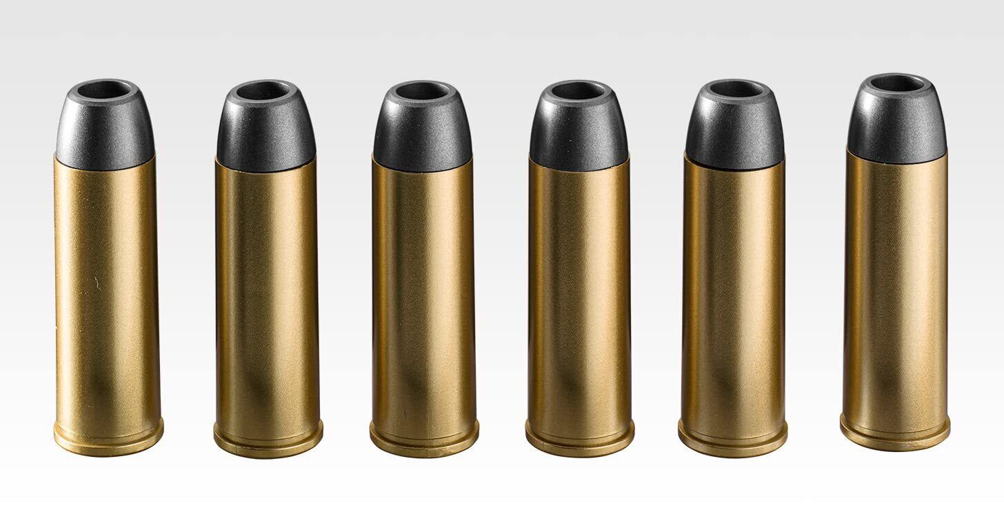 【カートリッジ6個が付属】BB弾を1発ずつ装填できるカートリッジが6発分付属。フルコックによってシリンダー内で弾頭部が可動し、命中精度がアップします。