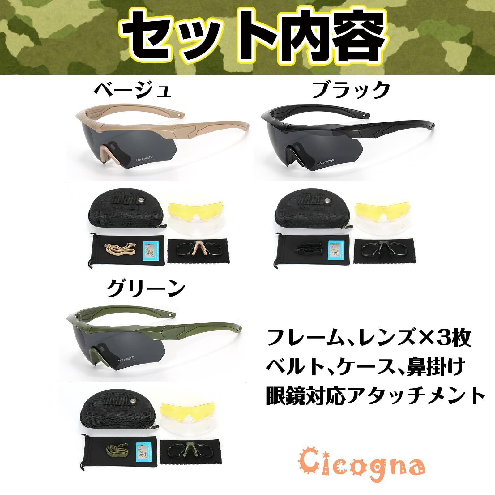 【特価商品】[Cicogna] タクティカルゴーグル サバゲー用 シューティンググラス 3色交換レンズ付き サングラス 偏向レンズ メガネ対応 アイセーフティ ウェア 目保護 アイガード (グリーン) | wakuwakuland