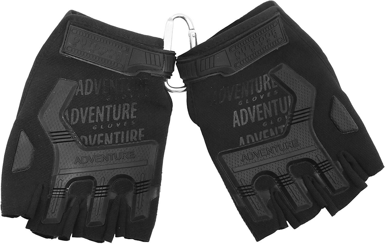ハーフフィンガー(指切り) グローブ 左右セット;首をマジックテープで留めてサイズ調整が出来るタイプです。手の平はラバーグリップ滑り止め加工が施されています。保管用カラビナ(アルミ/30×55㎜) 付属 ⇒不使用時にアジャスター部分を結束してグローブをペアで持ち運び・保管が出来ます
