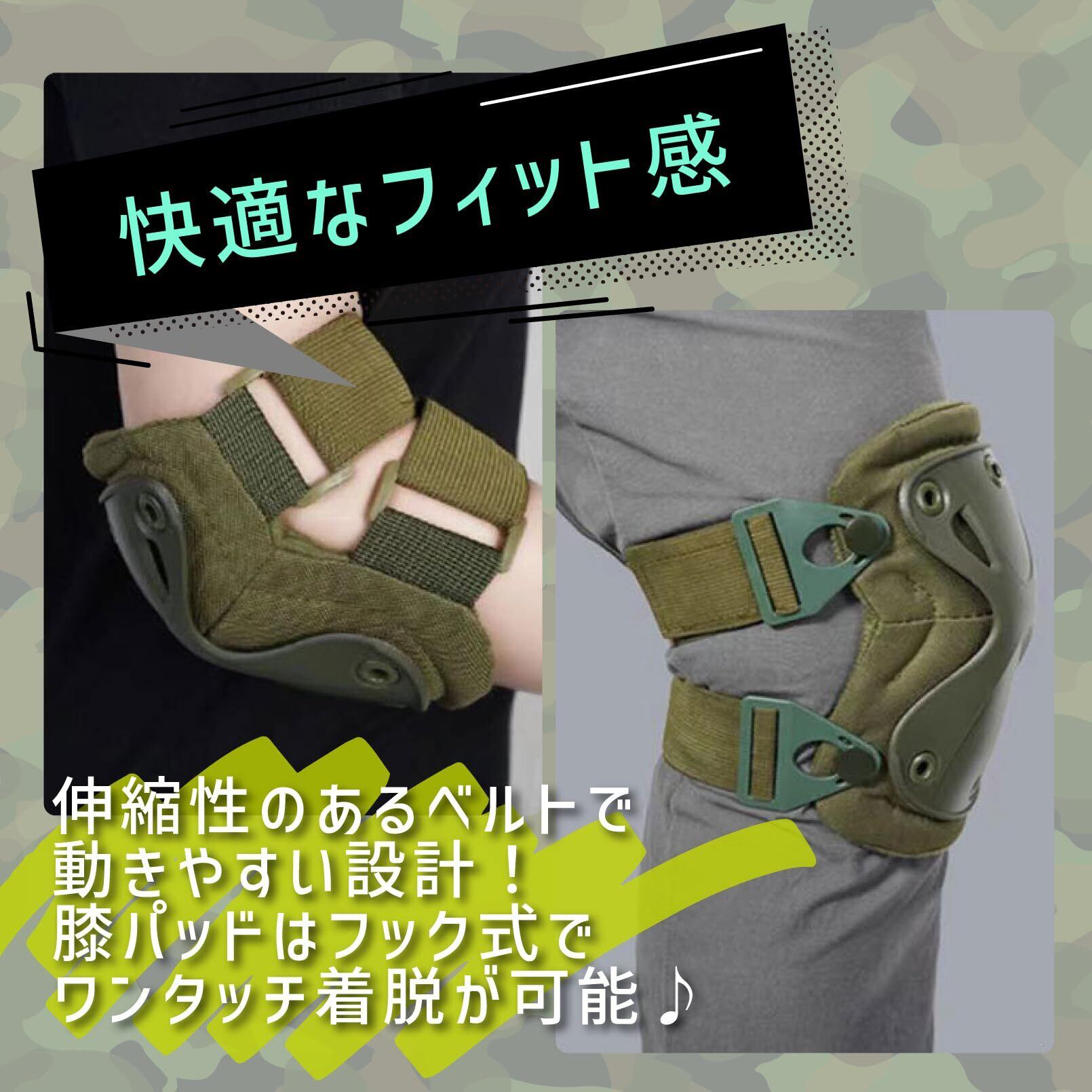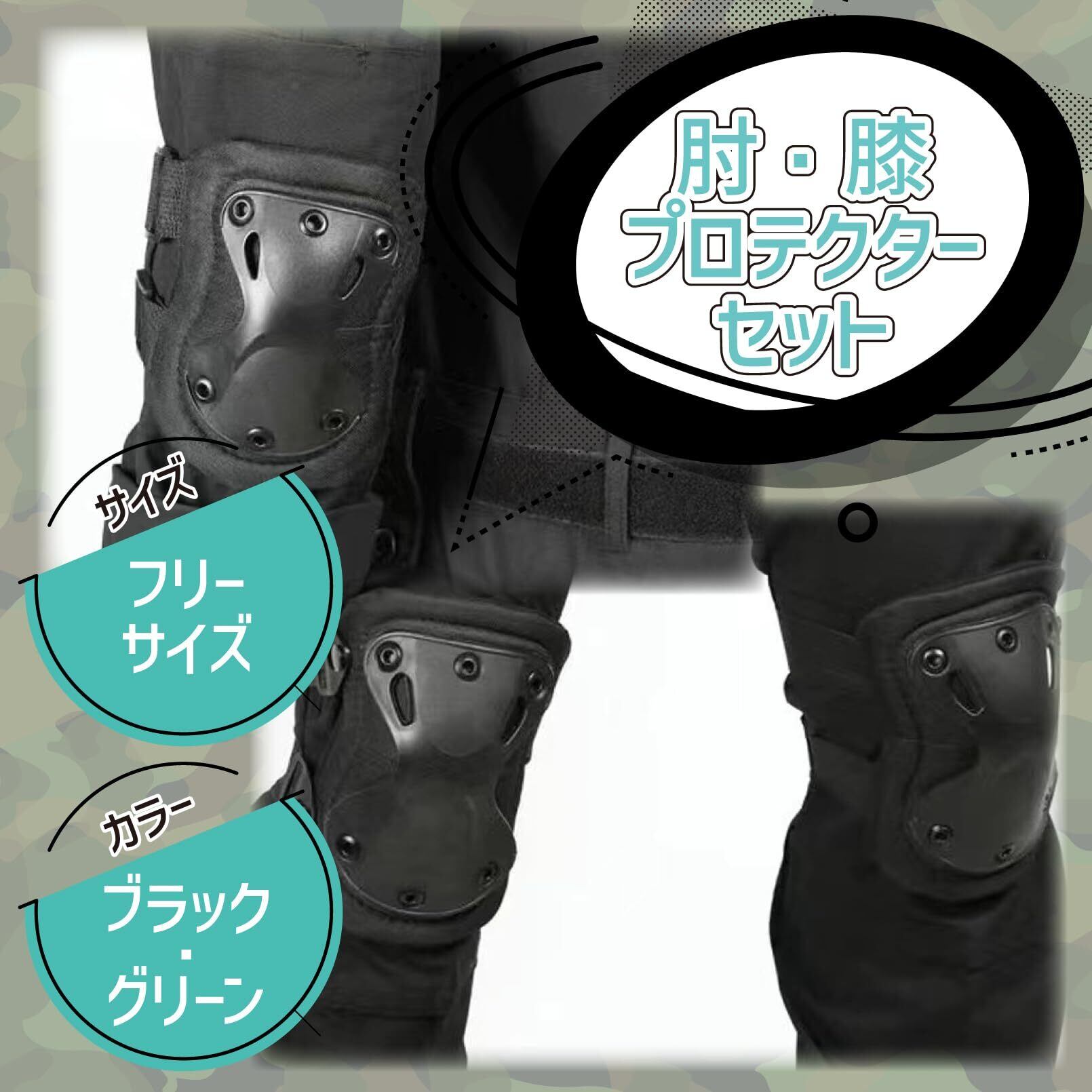 サバゲーやスポーツに!膝&肘用プロテクターセットです。転倒時の衝撃からヒザとヒジをしっかりガード!活動を妨げず快適にフィットするフリーサイズ設計です。カラーはブラックまたはグリーンからお選びください。