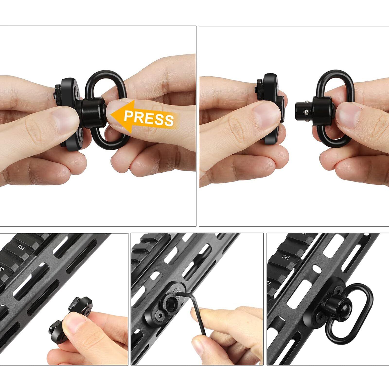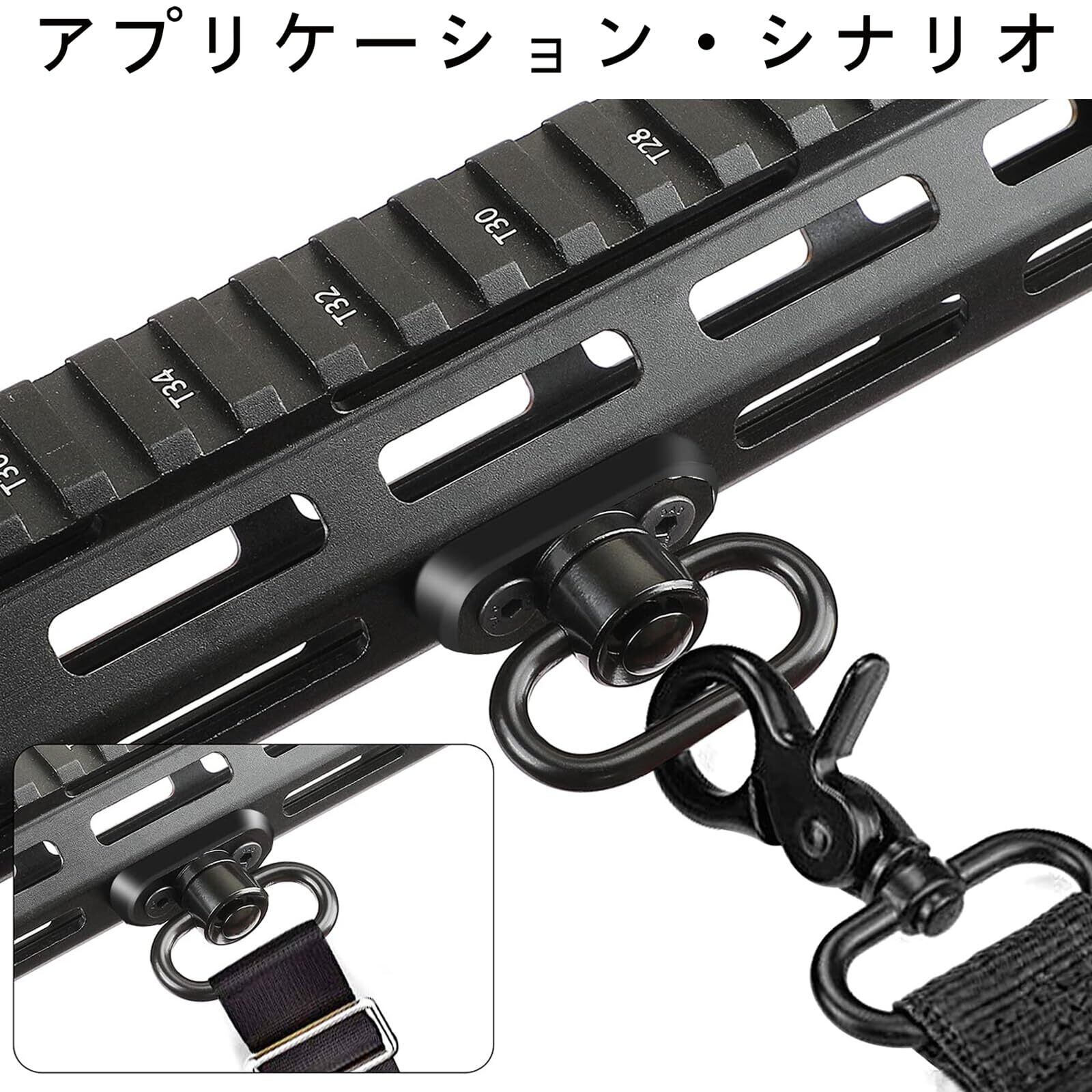 取り付け:ワンタッチで脱着簡単なQDスリングスイベルです。スリングマウントは360度回転でき、QDボタンを押すことによって位置を制御することができます。