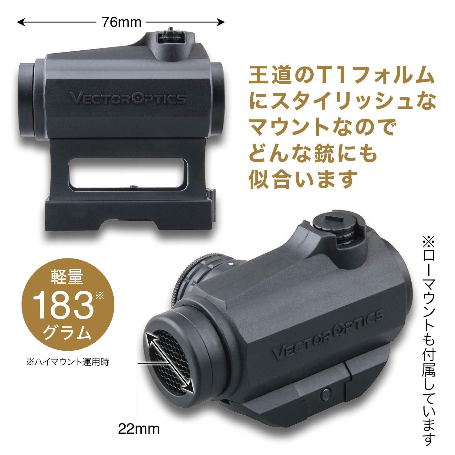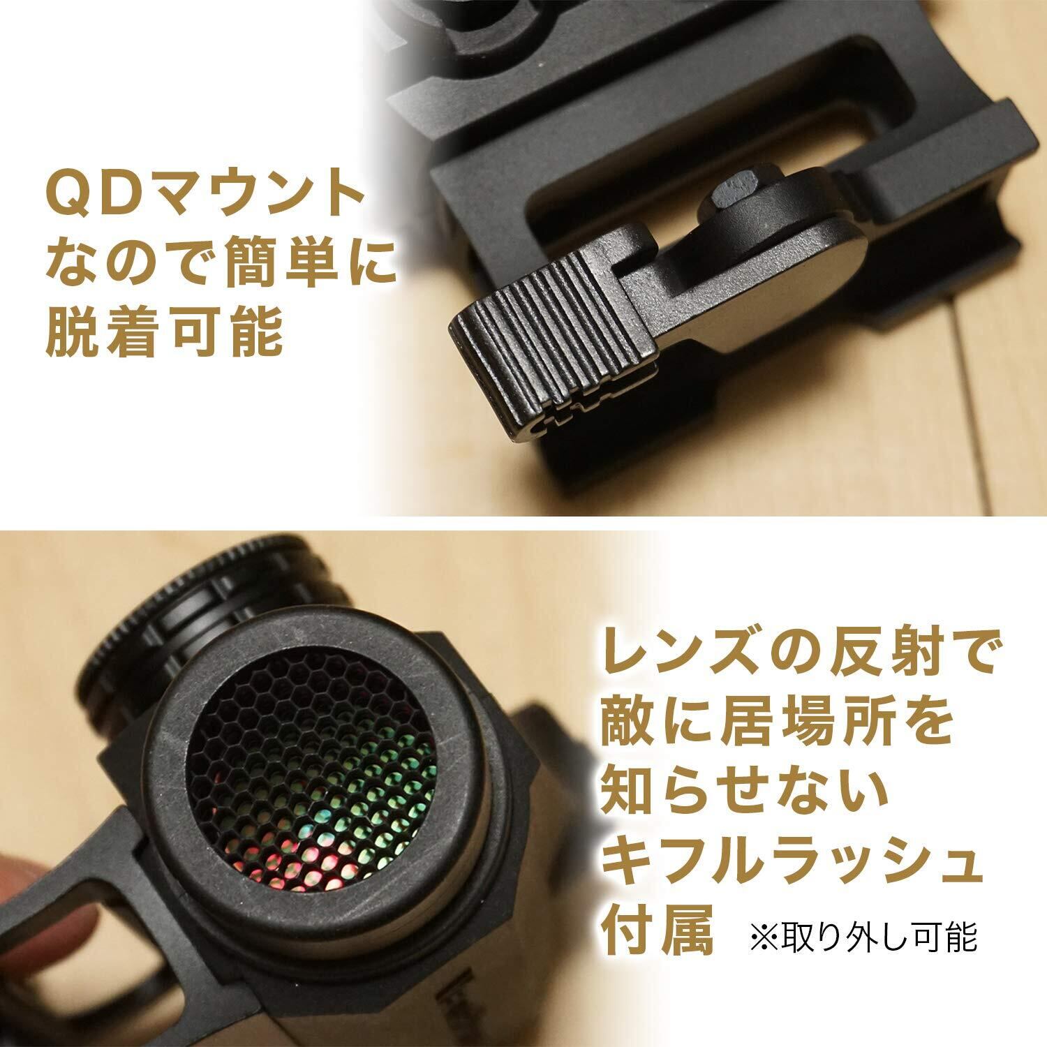 透明度の高い22mmの対物レンズを搭載したドットサイトです。ドットサイズは3MOAで、高品質な6061アルミニウム製のボディは防水・防塵・防霧に対応しています。移動するターゲットも見失わず、高い衝撃性能を備えています。