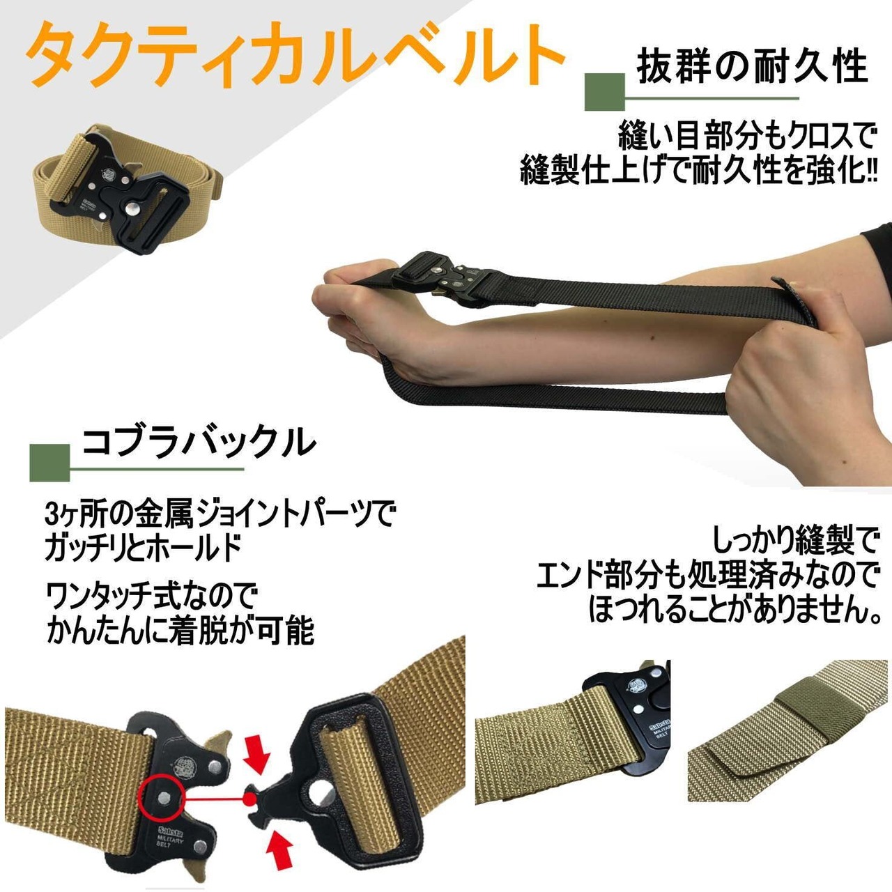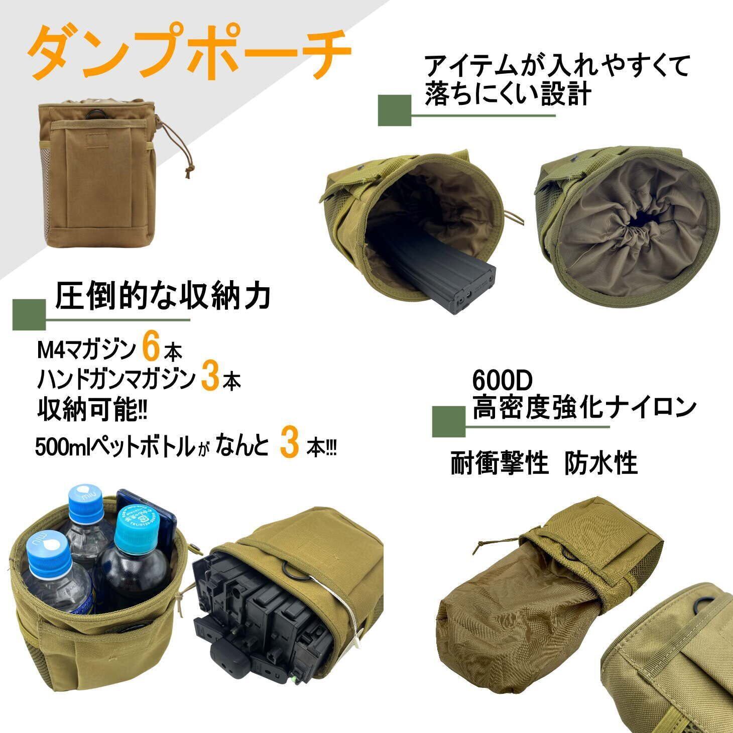 タクティカルベルト・モールベルト・ダンプポーチ・多機能ベルトポーチのサバゲー腰回り4点セットです。 【 タクティカルベルト 】 <コブラバックルベルト> ワンタッチ式のコブラバックルを採用。堅固な3点式留め具で強度をアップされます。ミリタリー基準で設計されているので、サバゲーはもちろん、作業現場や登山など過酷な状況下でも3箇所の金属ジョイントパーツでがっちりとホールドしてくれます。また、ベルトはパッドから取り外し可能です。 <ワンタッチで着脱> 頑丈なメタルバックルは、ワンタッチで簡単に着脱可能。さらに、激しい動きでもしっかりとホールドします。(※パンツからベルトを外す際は、バックルからベルトを引き抜いて取り外してください。パンツのベルトループの幅が広いものはそのまま取り外すことも可能です。)<サイズ・重量>124㎝×3.7㎝ 198g