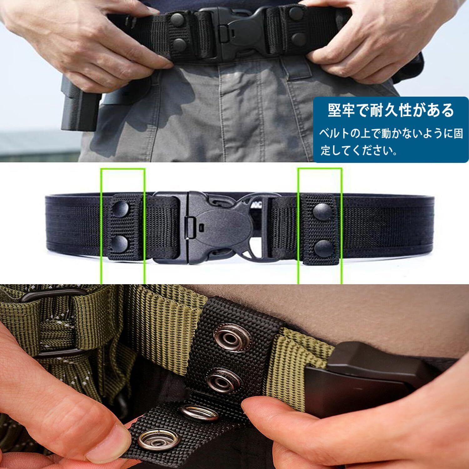【固定用に】 ベルトループに通さず使用するタイプの装備ベルトを、ズボンのベルトと固定してずれ落ちるのを防いだり、ミリタリーのアクセサリーが動かないように固定するために役立ちます。ベルトループに通したインナーベルトの上から装着するアウターベルトを固定するための、スナップボタン式のベルトキーパー。