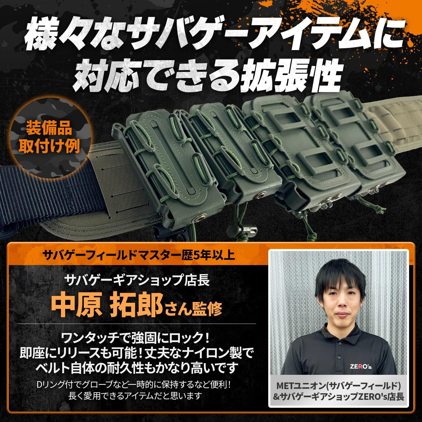 ダンプポーチ、ホルスター、マガジンポーチなど様々なサバゲーアイテムに対応できる拡張性。MOLLE(モール)はもちろんベルトサイズ対応の装備品も取付け可能