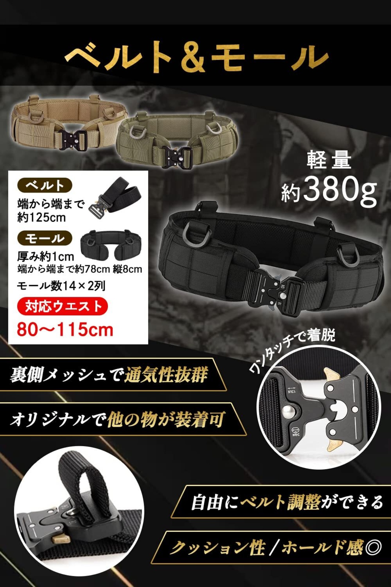 【タクティカルベルト】MOLLEベルトが縦2連横14列で均等に配置、装備の自由なカスタマイズが可能!【サイズ】適合ウエスト80cm~115cmで自分にぴったり調整可能!【moleベルト】長さ78cm、高さ8cm、厚み1cmのスリム設計で機能性とスタイルが両立!サバゲーの世界を初心者からも楽しく体験できる、アクティブなあなたの新たな必須アイテム!全ての冒険者に捧ぐ、タクティカルベルトでサバゲーの扉を開こう!