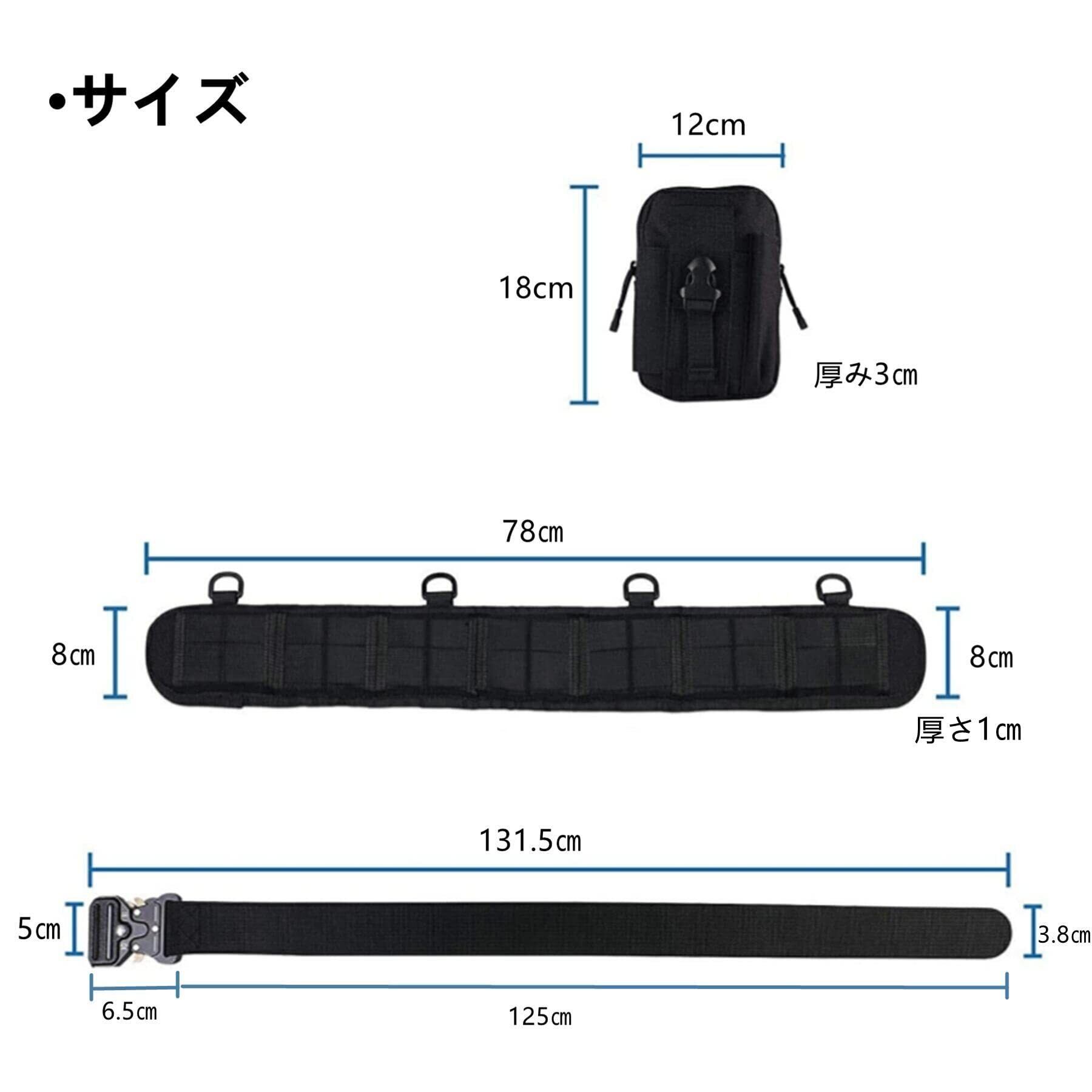 サイズ:タクティカルベルト(131.5㎝×5㎝)、タクティカルベルトパッド(78㎝×8㎝)、ポーチ(18㎝×12㎝)。