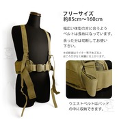 3段のMOLLEが配置されたサスペンダー付きタクティカルベルトです。均一なMOLLEウェビングに様々なアイテムを取り付け可能。両サイドにはレッグ装備ベルトも通せます。フリーサイズ:85cm~160cm、重量:約365g、材質:オックスフォード生地/ナイロン