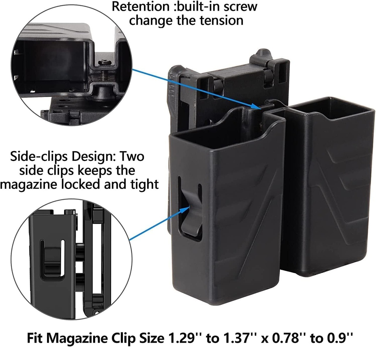 【クリップ付き】マグポーチのインナーサイズは必要に応じて調節可能です。2つのサイドクリップは、マグケースの内側の長さを1.29''から1.37''、内側の幅を0.78''から0.90''にすることができます。マガジンをしっかりとロックし、動かないようにすることができます。