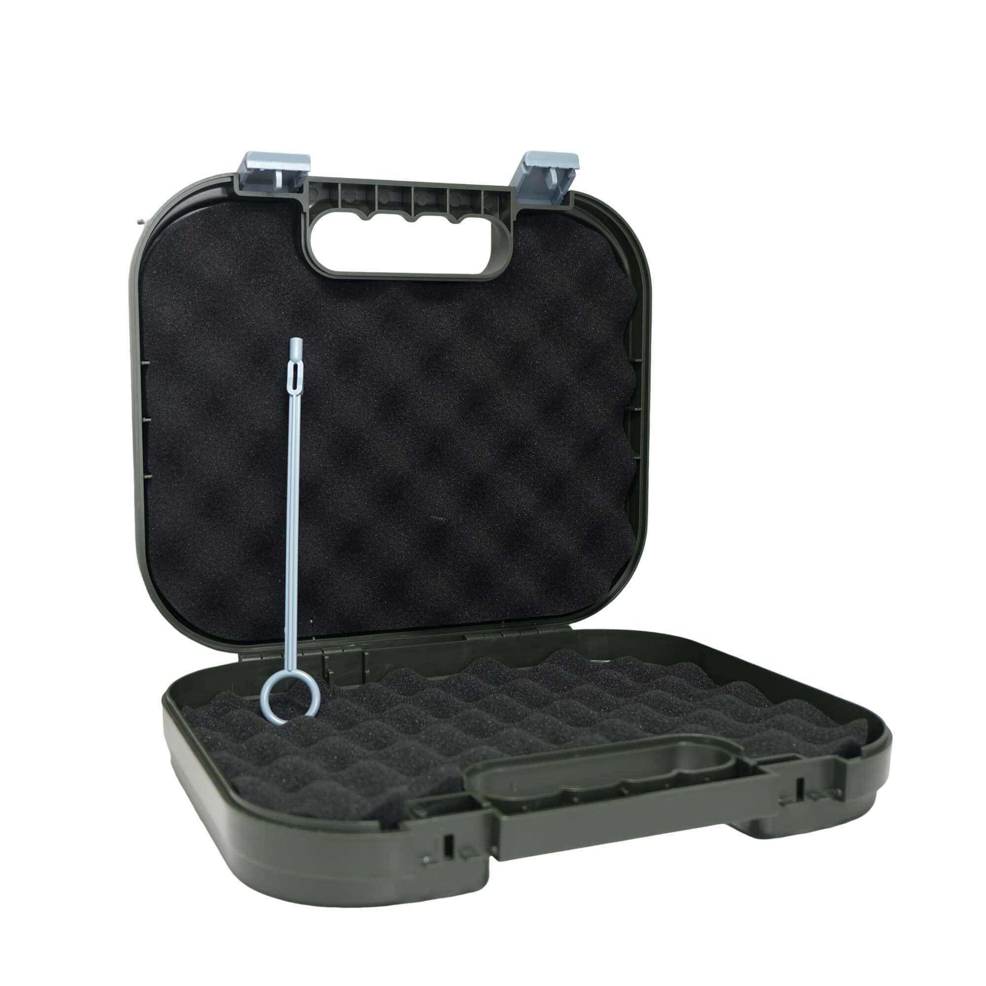 G17/G18C/G19/G22/G26/G34/G45などのグロックタイプハンドガンに対応したウレタンフォーム内蔵ハードケースです。内部には高密度ウレタンフォームを採用し、ハンドガンを優しく包み込みながら外部からの衝撃を吸収。外装は軽量かつ高耐久なABS系プラスチック製で、持ち運びにも適したコンパクト設計(L265×W240×H60mm)です。ケース表面とバックルにはGLOCK風のモールドが施されており、リアルな外観を演出。収納性・保護性能・デザイン性を兼ね備えた、サバゲーや保管用に最適なガンケースです。