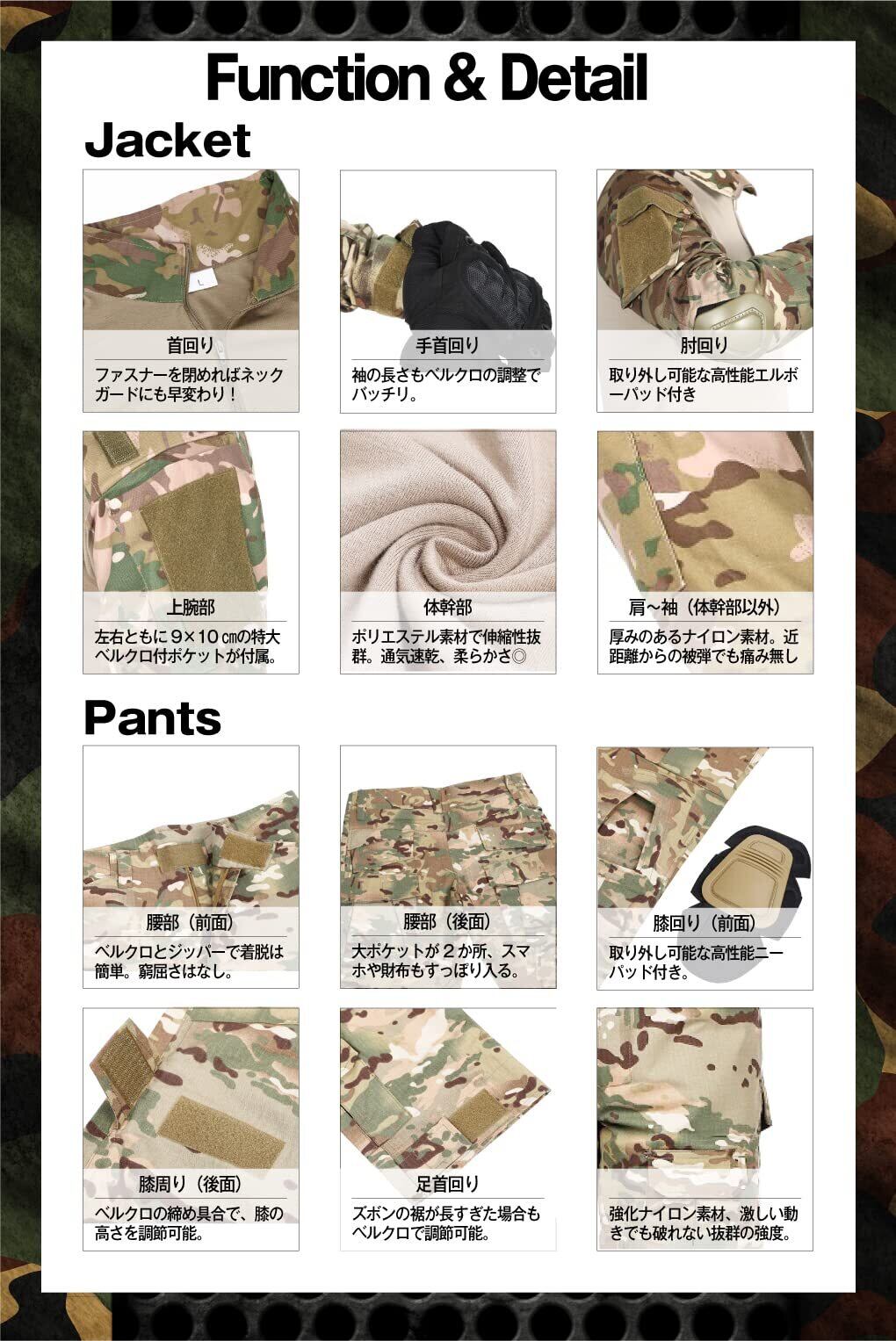 コンバットシャツタイプの迷彩服(上下セット)です。素材はナイロン+ポリエステルになります。ポリエステルの部分は伸縮性・吸汗性抜群です。簡単に取り外しができるエルボーパッド・ニーパッド付です。通気性も良く、季節は春、夏、秋、冬とオールシーズン使用可能です。