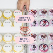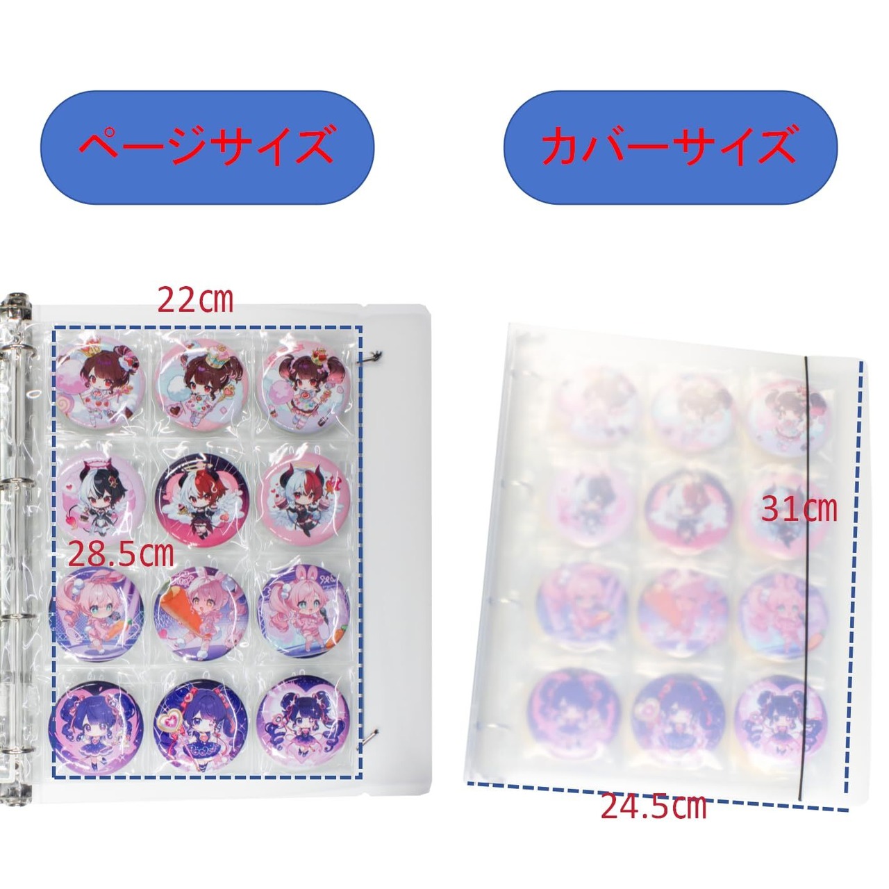 【最大96枚収納可能】缶バッジ収納ファイル*1枚、缶バッジ収納ファイル*8ページです。1ページにつき12ポケット、合計6ページで最大96枚収納可能です。缶バッジなどの形状に最適です。