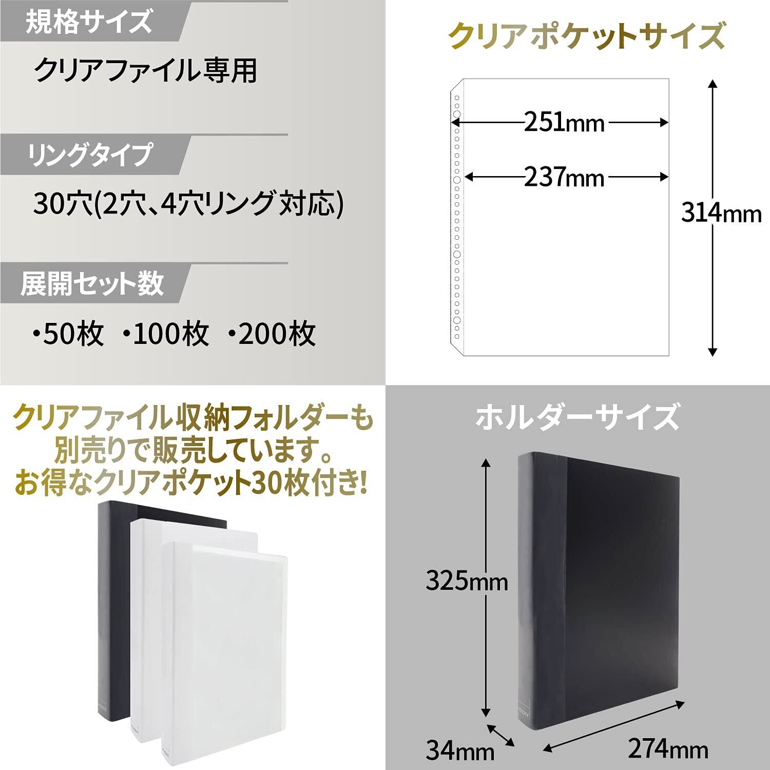 【サイズ】縦 314mm × 横 251mm /【収納サイズ】縦 314mm × 横 237mm クリアファイル収納サイズ /【セット数】50枚入り /【タイプ】30穴(2穴、4穴リング対応) ※特殊なサイズのためHMDERYのクリアファイル収納ホルダーへのセットをおススメします。