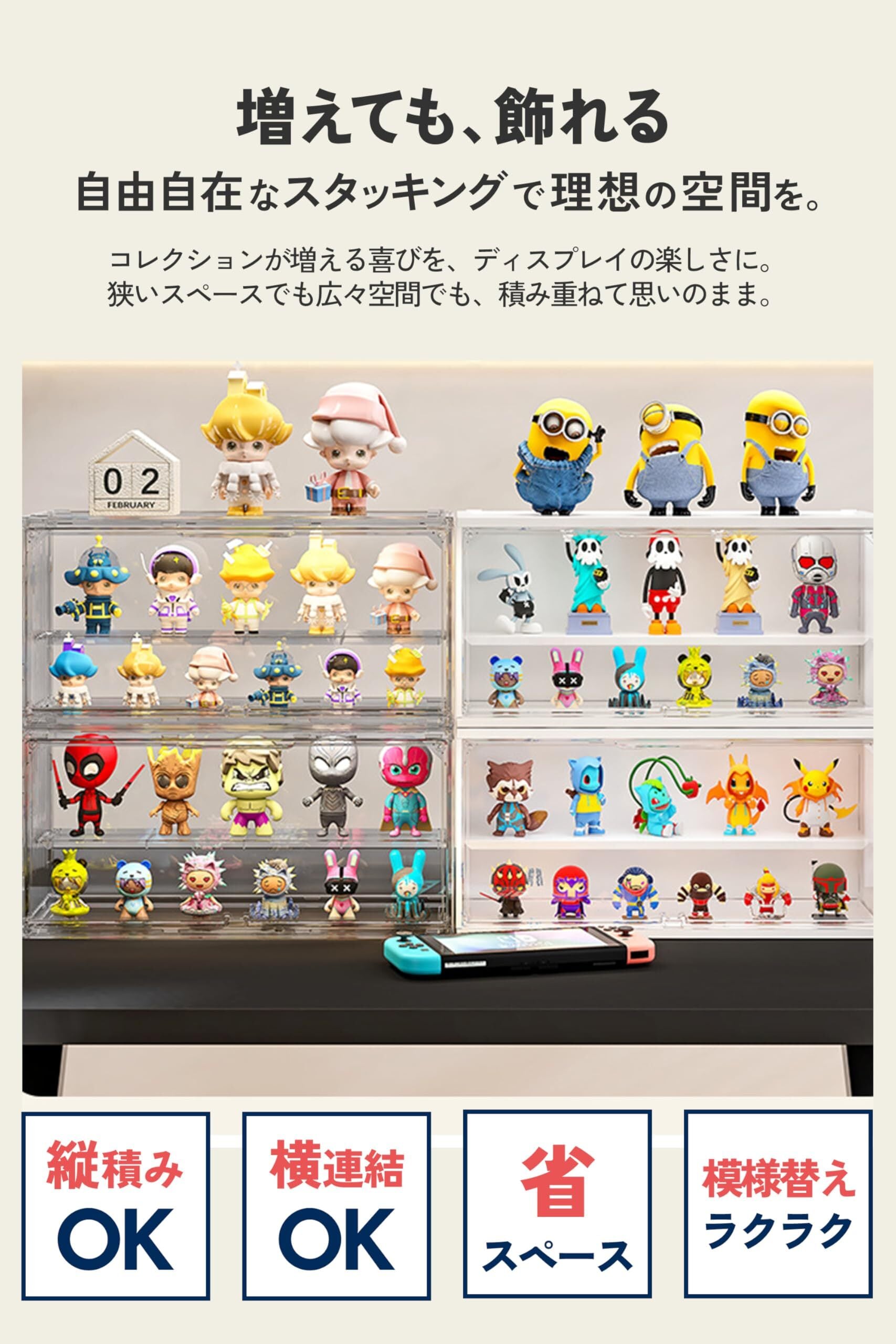 【サイズ自在の調整力】フィギュアのサイズに合わせて仕切りを自由に調整して収納できるアクリル製のコレクション棚。大型フィギュアも収納でき、取り外し可能な仕切りでジオラマ風の展示も楽しめます。ディスプレイボックスとしての使いやすさを追求した透明ケースは、幅広いコレクション収納に対応します。