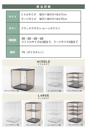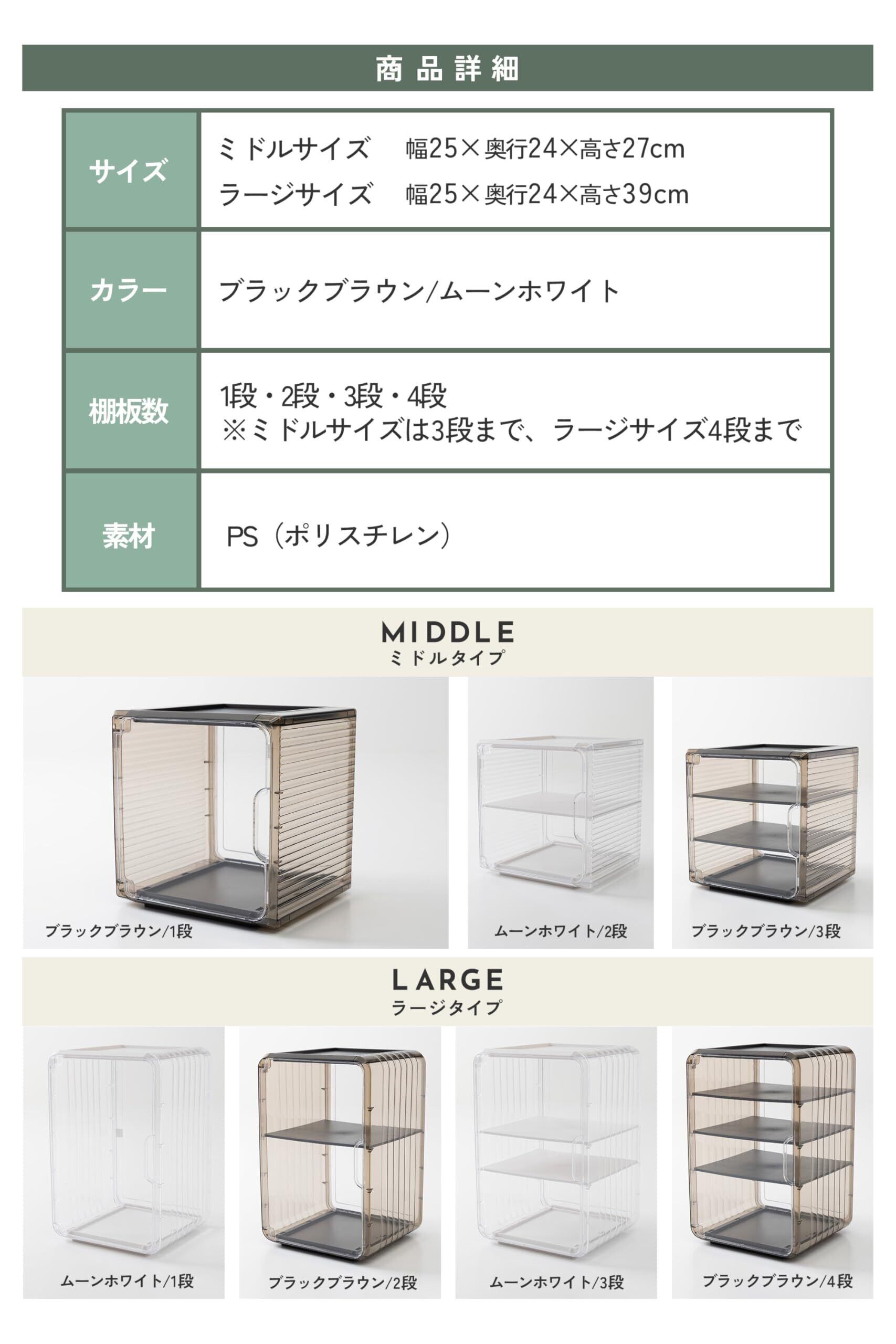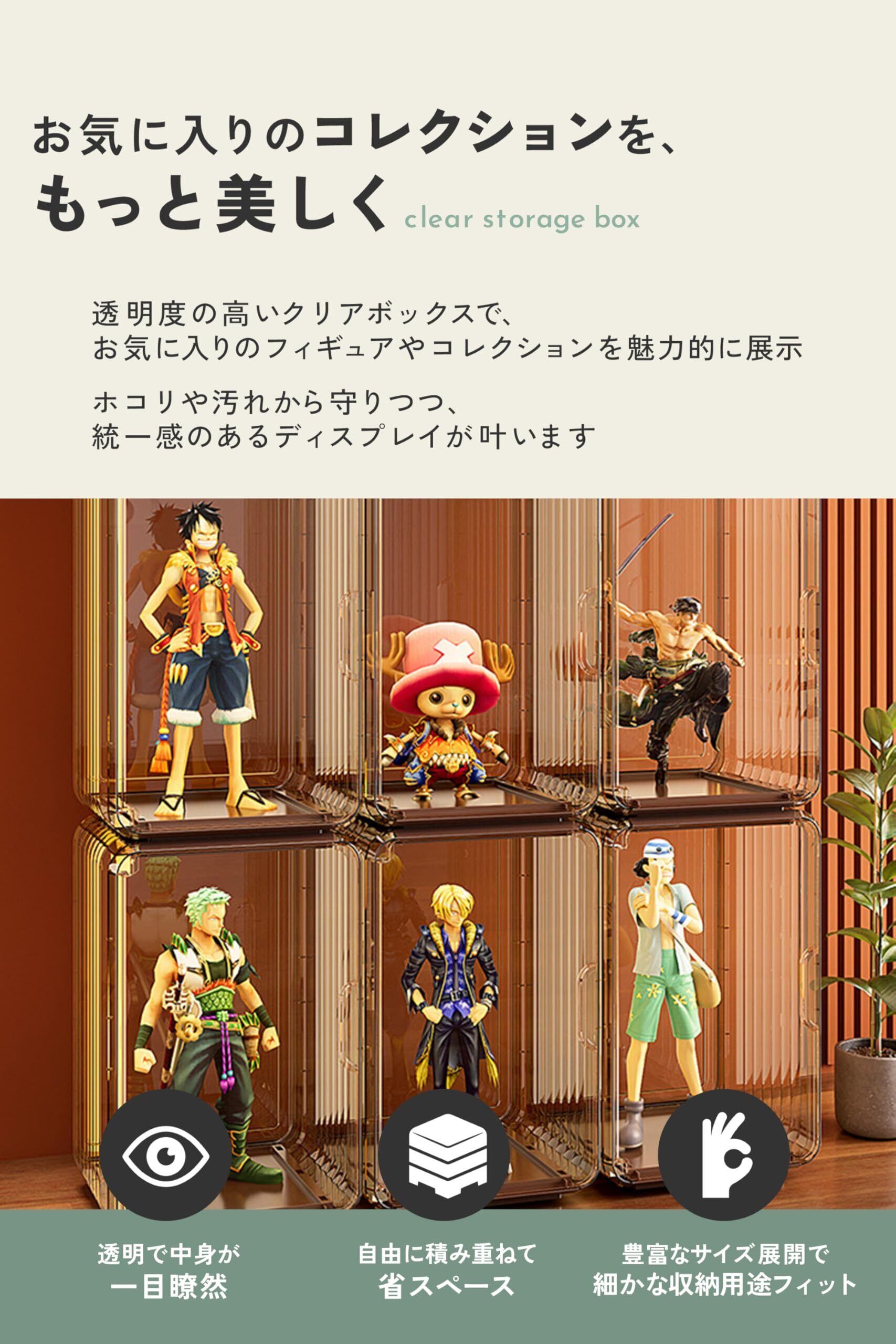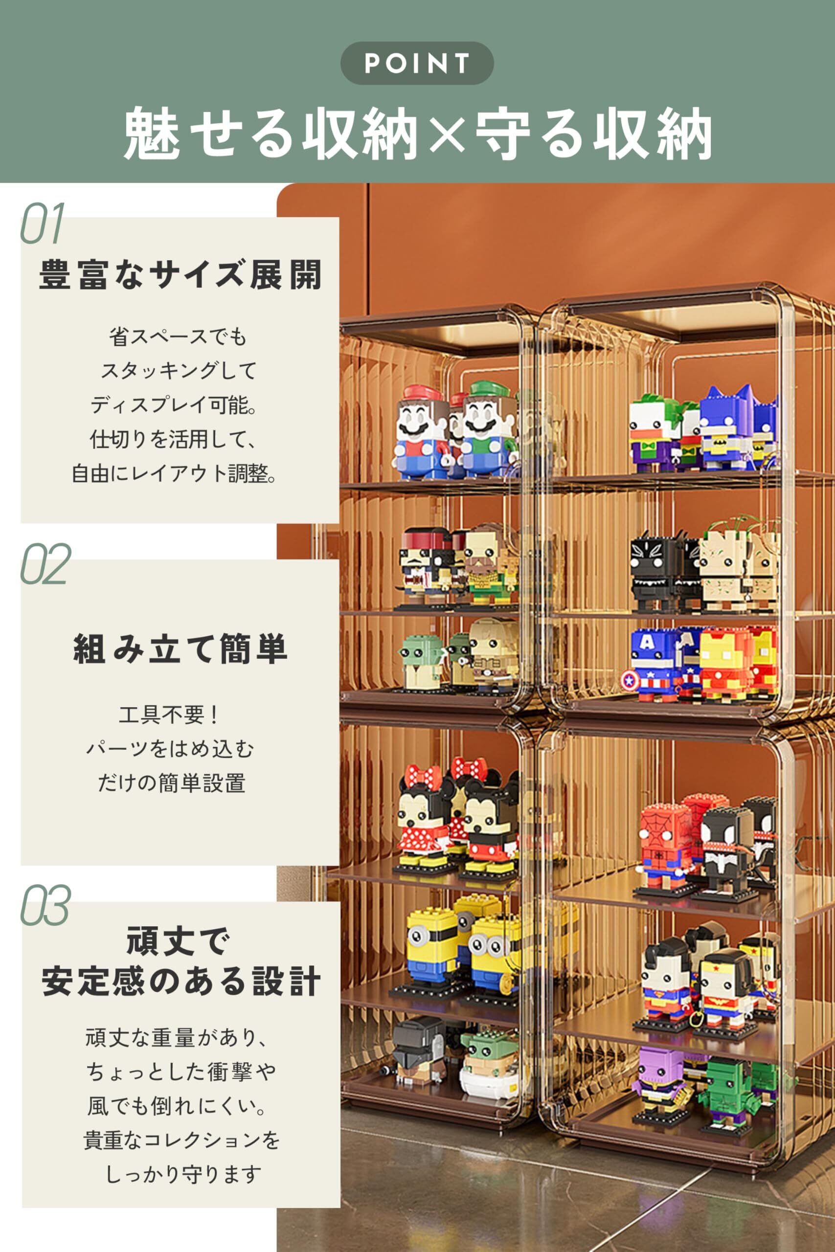 【飾り方自由、選べる2サイズ展開】 中型(25×24×27cm)・大型(25×24×39cm)サイズを用意し、重ねて使える省スペース設計。仕切りパーツ付きでフィギュアに合わせた調整も可能。コレクション棚として収納も美しく。統一感のあるフィギュア用ケースをお探しの方にぴったりなクリアケース(フィギュア収納)です。