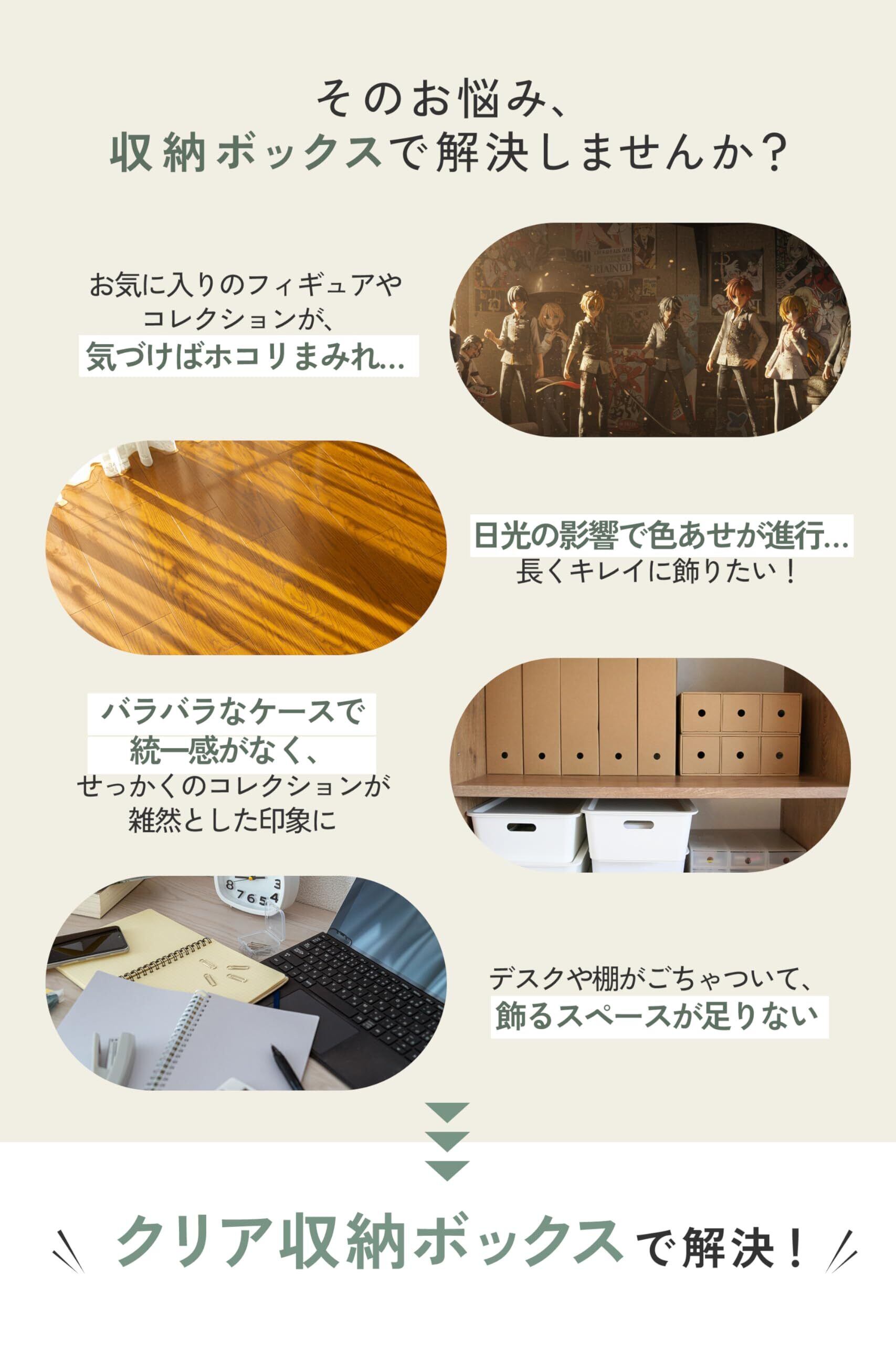 【ホコリ・汚れから守る】 大切なコレクションを守るために、素材にはポリスチレンを使用。透明ケースで中身を美しく見せつつ、外部のホコリや汚れからしっかりガード。出して飾る楽しさはそのままに、フィギュア用の収納としての機能性も追求したディスプレイケースです。