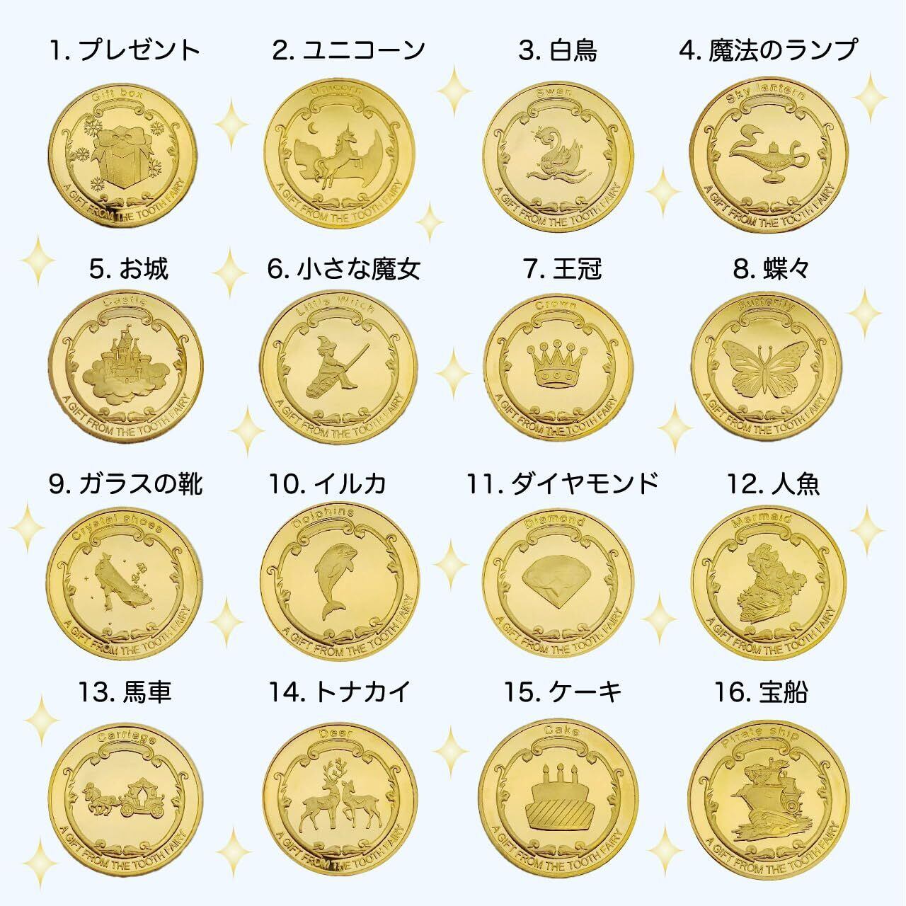 【歯の妖精コイン】子供の歯の生え変わり期に目覚めたら枕元に、歯と交換するコインが 歯の妖精から美しい記念コインのプレゼント! 【幸運へ導く金貨も入ったバラエティセット】同じコインをあげ続けると感動がどうしても薄れるもの。なんと、厳選された絵柄の16種類もの金貨がセットされています。毎回貰うのがとっても楽しみ!どれも子供の成長と幸運を願う意味が込められた意味のある金貨です 【様々な用途にも】乳歯と交換コインの他にも、記念コイン、コインコレクション、こどものおもちゃとしてのプレゼント(おままごとや発掘金貨体験など)、乳歯ケースと一緒に入れる記念としてなど、色々お使い頂けます。 【商品詳細】・歯の妖精のコイン16種 / 16枚セット(絵柄は画像をご覧ください)*1枚づつ透明のプラスチッククリアケースに入っています。