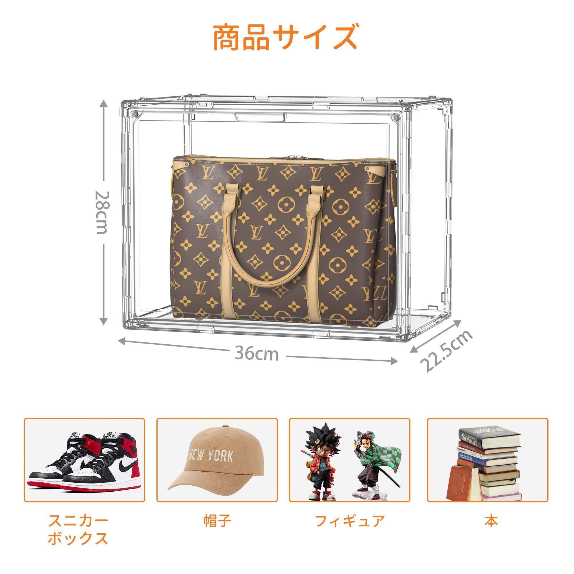【透明の収納ケース】ディスプレイケースは透明度が高く厚みのあるアクリル素材で作られ、あらゆる角度からお気に入りのバッグをはっきりと表示できます。36cm(長さ) x 22.5cm(幅) x 28cm(高さ)の大容量で、お気に入りのフィギュア、カバン、帽子、スニーカー、洋服、化粧品、小物入れの陳列棚として扱れます。