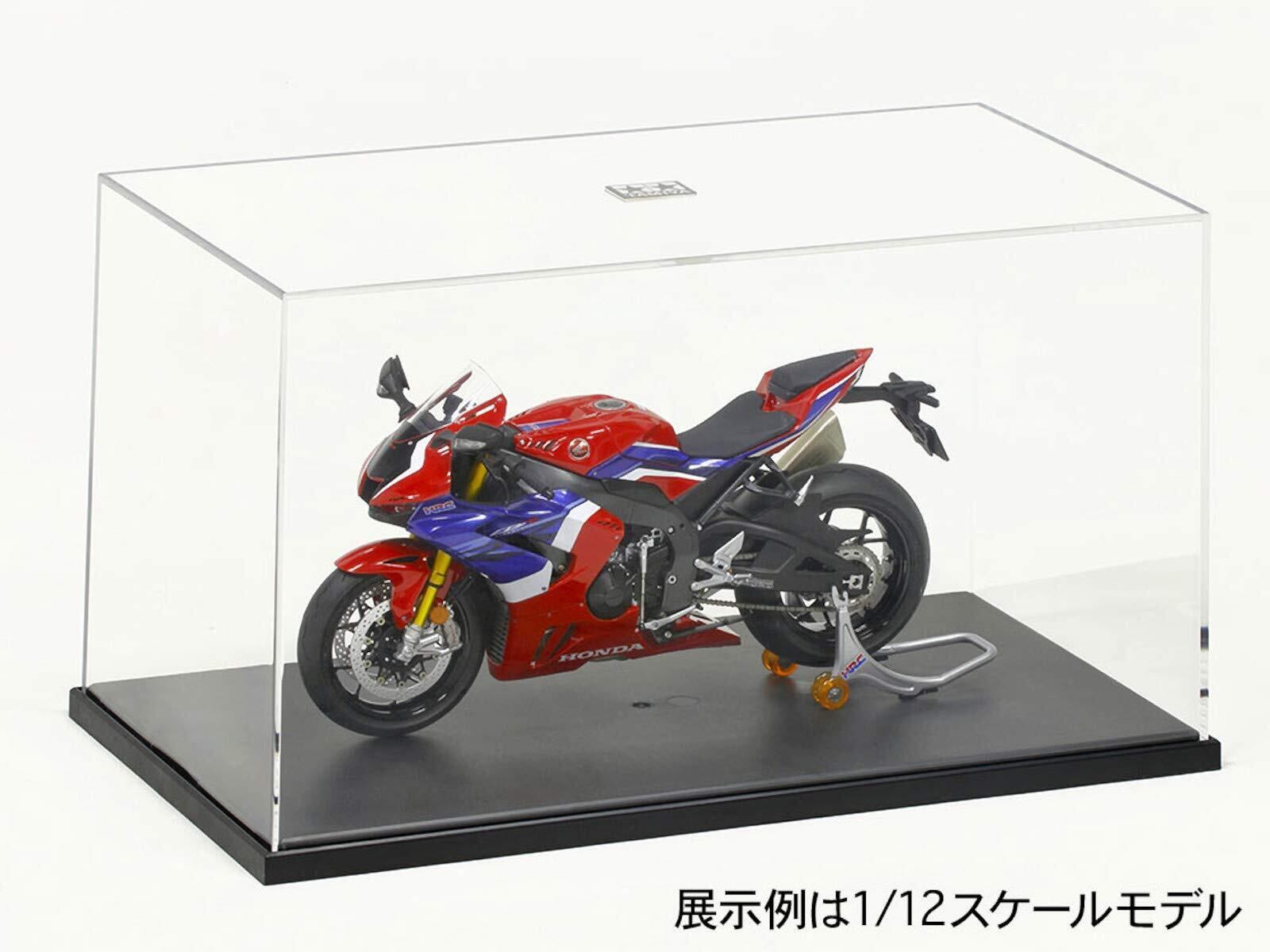 1/12スケールのオートバイモデルやワンボックスなど背の高い自動車モデルがピッタリ入る、幅240mm奥行き130mm高さ140mmサイズ。ケースは高い透明性を持たせたスチロール樹脂製、ブラック仕上げの台座はディスプレイケースCと同じサイズで積み重ねやすい形状。