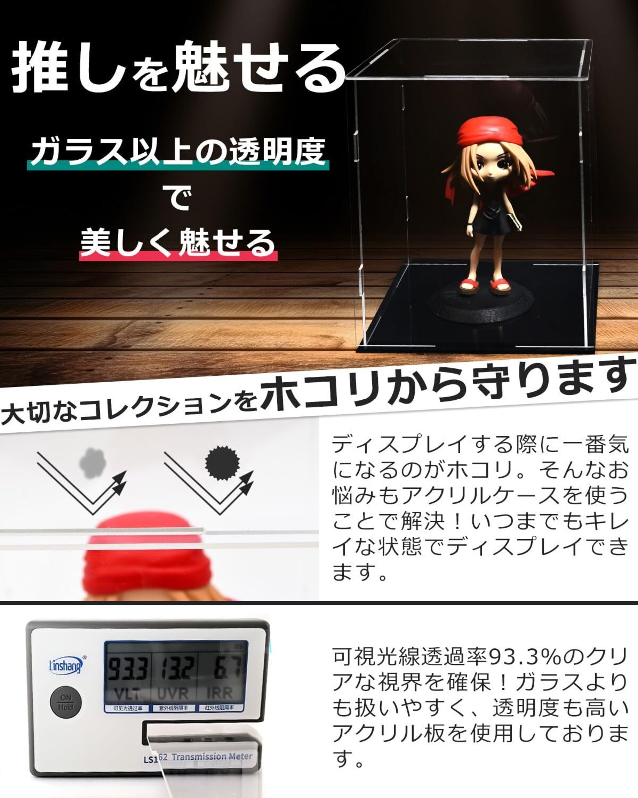 【素材】高品質アクリル製 透過率93.3% クリアな視界を確保しながら、ホコリや汚れから大切なアイテムを保護します。
