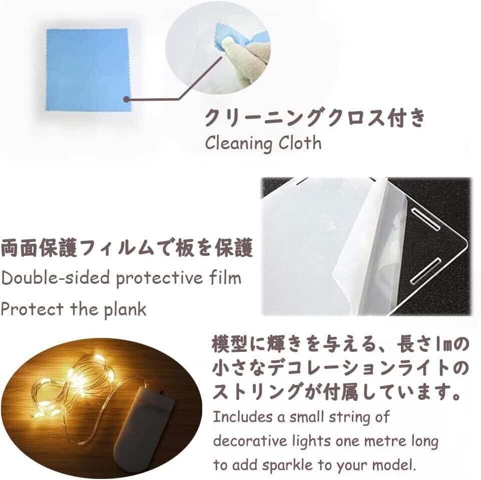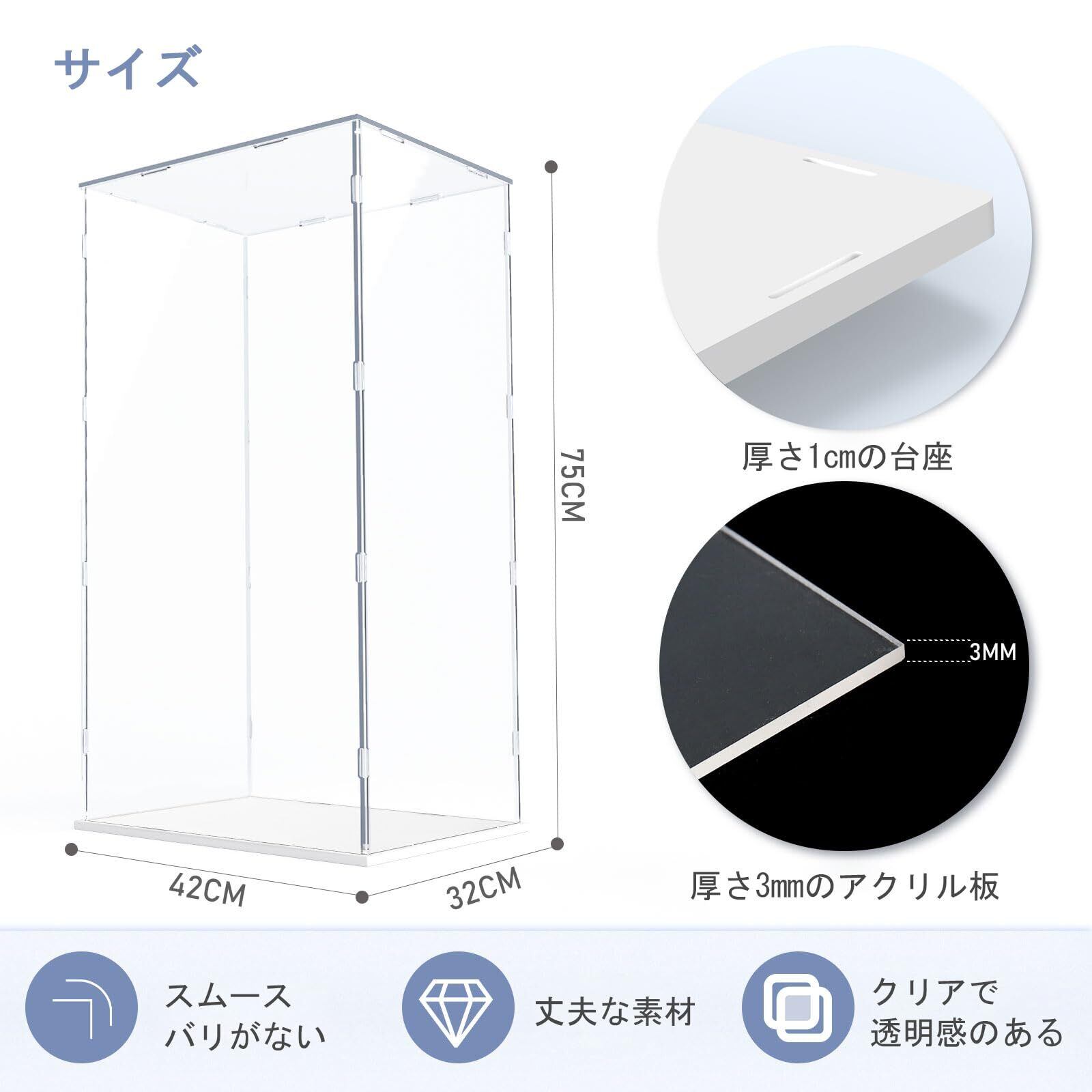 素材:ディスプレイケースは、透明度の高いアクリルパネルと、PVCマイクロフォームパネルベースで構成されています。アクリルパネルに傷がつかないように、両面のアクリルパネルを保護フィルムでラミネートしています。