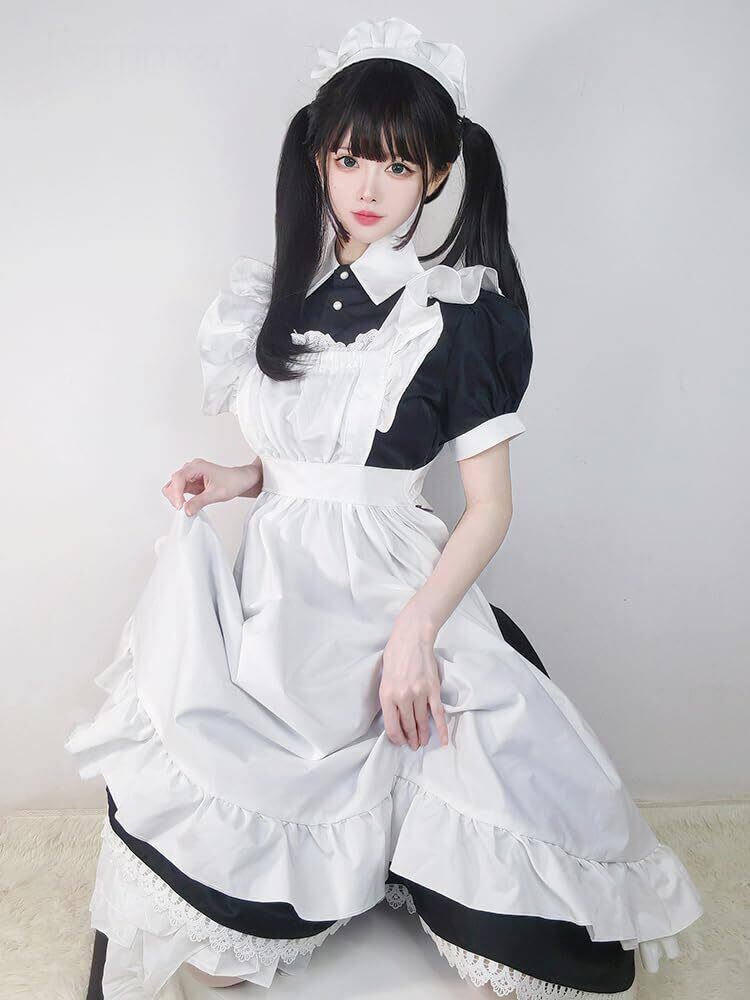 【デザイン】英国風調の落ち着いたデザインのメイド服です、黒と白のカラーリングがシックで上品な雰囲気を醸し出しており、フリルのついたエプロン、王道の黒×白カラーで本格的で上品なメイドさんになりきりロリータスタイルを愛する方にぴったりです。男性の方でも着用できるデザインなので、カップルやペアで楽しむことも可能です。