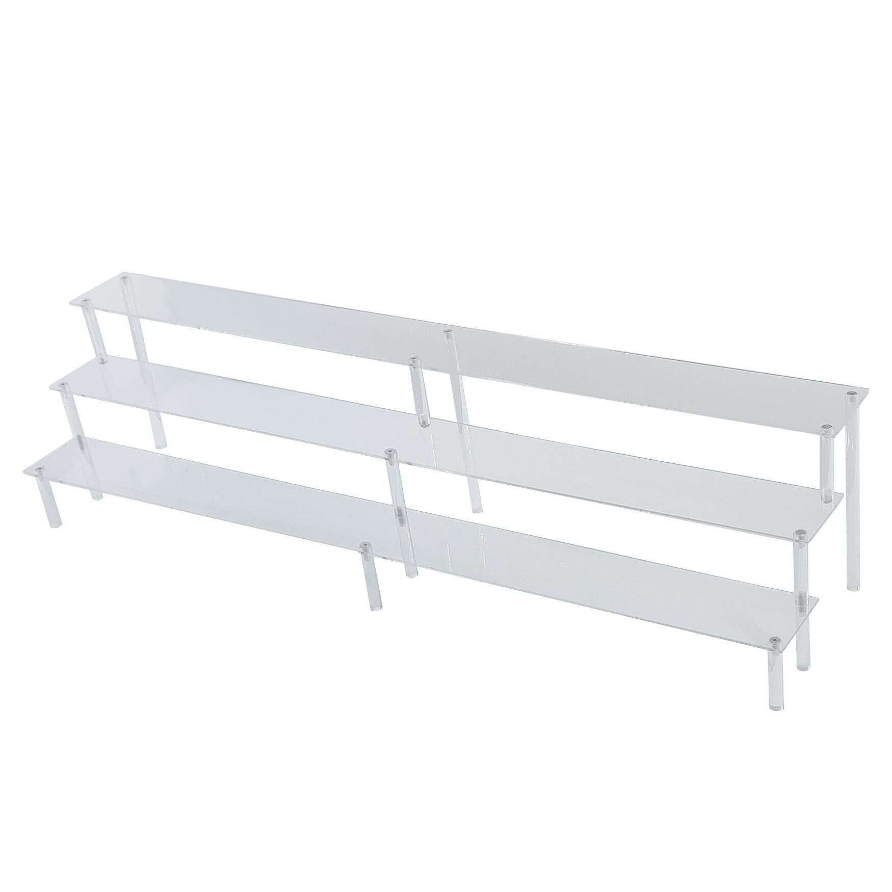 【サイズ】外寸:幅71cm 奥行16.5cm 高さ17.6cm(上段高さ:17.6cm、中段高さ:11.7cm、下段高さ:5.8cm) 【耐荷重】各棚支柱間0.4kg 【材質】アクリル樹脂 【原産国】中国 【梱包サイズ】幅71.5cm 奥行7.5cm 高さ3cm