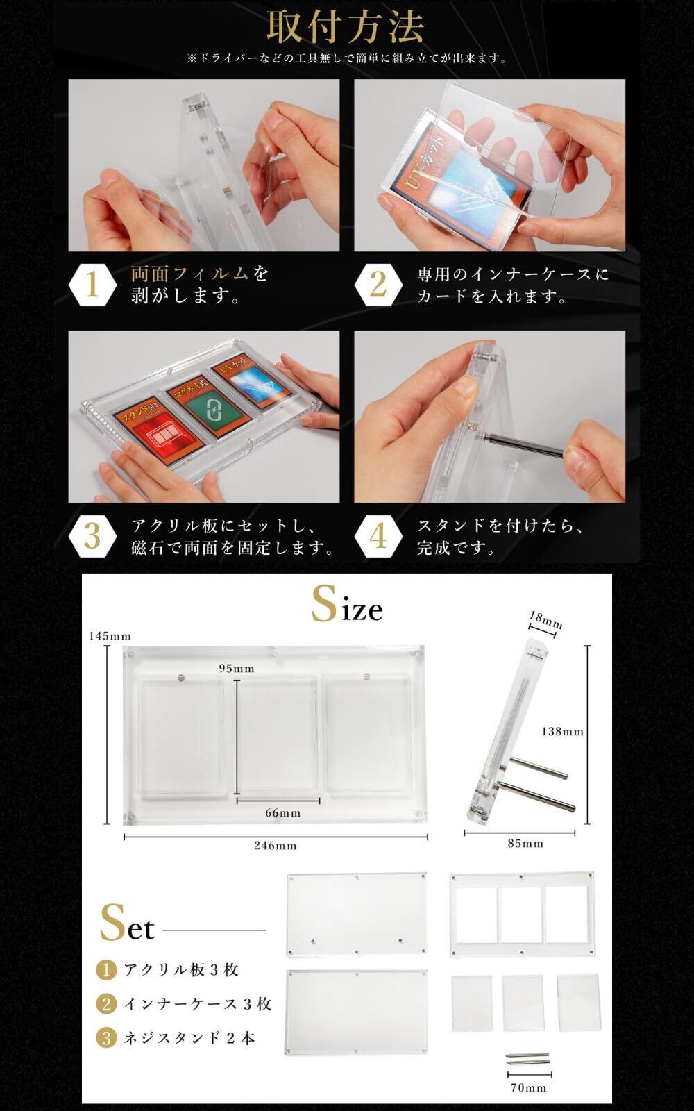 【あなたの大切なカードに高級感を】高透明度のクリアアクリルを使用。厚さ18mmで前面にダイヤモンドカット可能を施すことで重厚感と高級感を演出しました。見る角度でキラッと光り光沢感を持たせます。この厚みとダイヤモンドカットがカードの魅力を引き上げてくれます。 マグネットローダー本体と3枚のインナーケース、2本のスタンドネジで 工具不要 で組み立てられます。