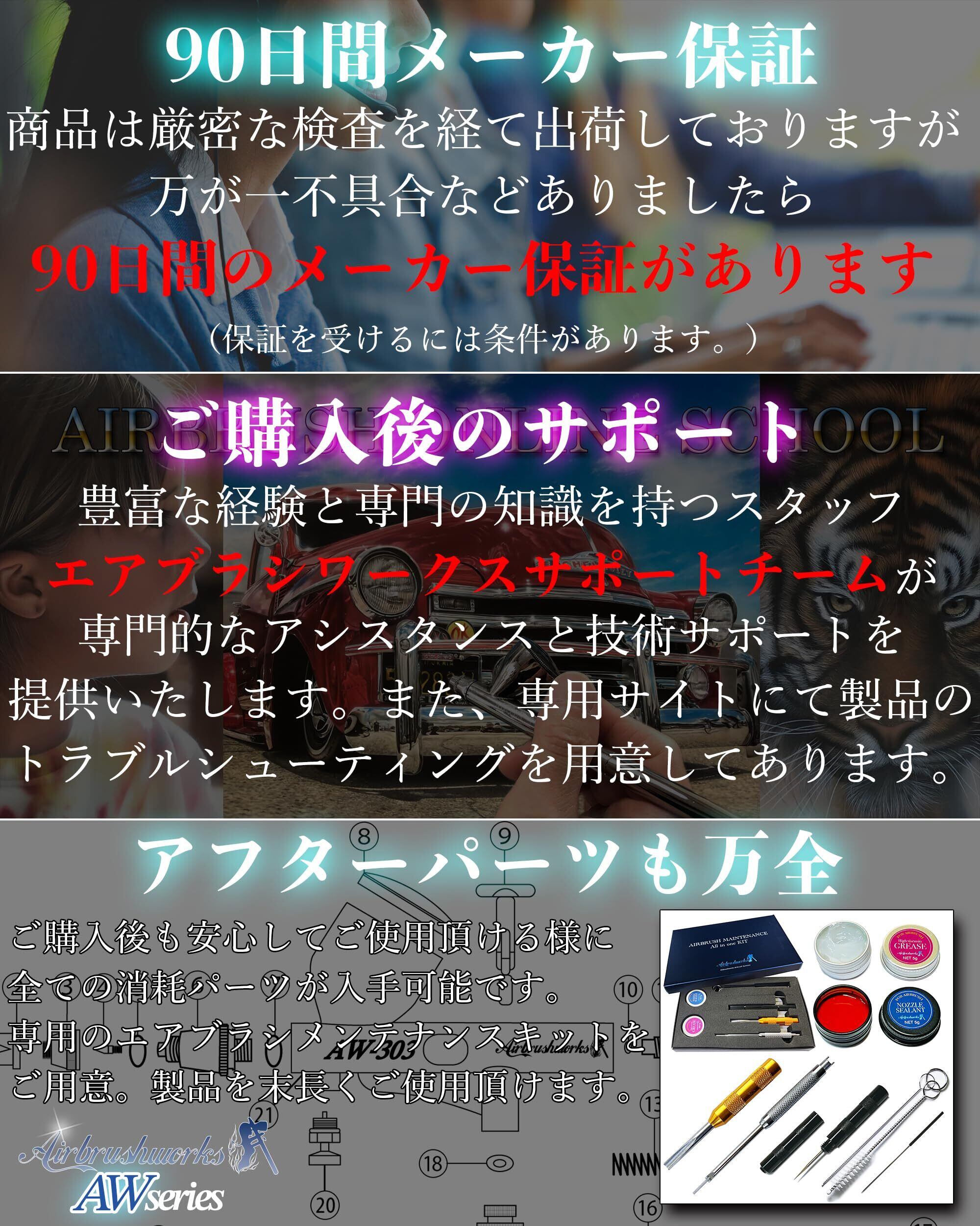 【アフターも安心】90日間のメーカー保証を提供します。消耗部品などのアフターパーツの提供やメンテナンスキットをご用意しており、製品を長くお使いいただけます。さらに、エアブラシワークスサポートチームが、製品の使い方のアドバイスやトラブルシューティング、メンテナンスと修理に関するサポートを提供します。お客様がエアブラシを快適に使用できるよう、専門のサポートチームが全力でサポートいたします。