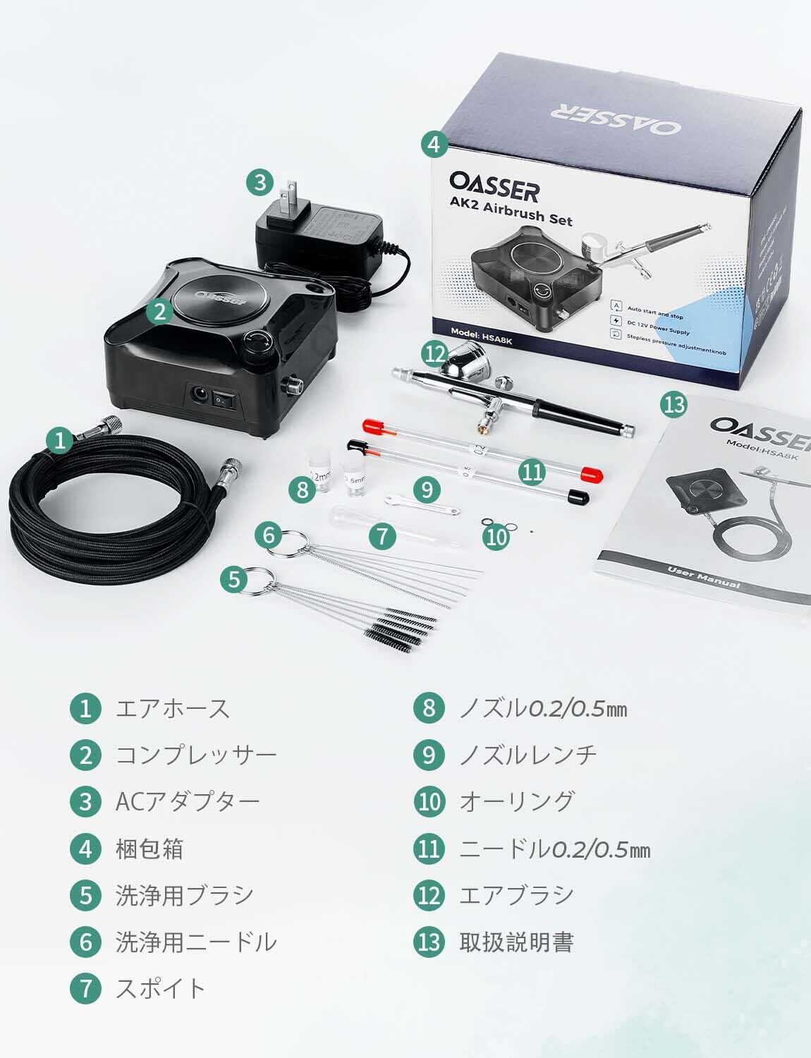 【特価セール】Oasser エアブラシ セット ミニコンプレッサー ダブルアクション 無段階圧力制御タイプ2-36PSI調節可能 プラモデルの塗装 ボディーアート 塗装用具 持ち運びやすい 初心者向け ノズル口径0.2mm 0.3mm 0.5mm (36PSI) | wakuwakuland