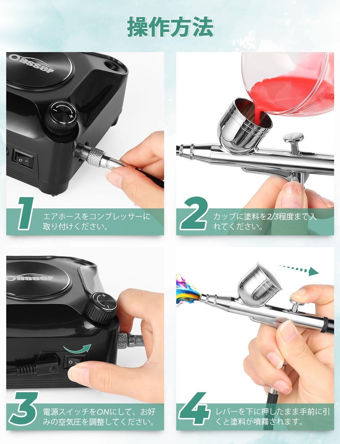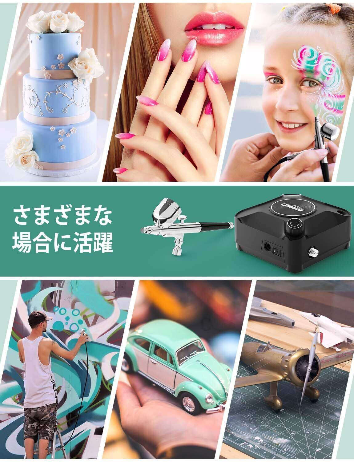 日本取扱説明書付いています。初めてエアブラシに挑戦する初心者の方に最適です。エアブラシとエアコンプレッサーの組み合わ、これワンセットで塗装工事を始まりましょう。プラモデル、ネイルアート、芸術アート、DIY手描き、化粧用、タトゥー、カー装飾、迷彩塗装などいろんな分野で活躍できます。ミニサイズで、持ち運びやすいです。