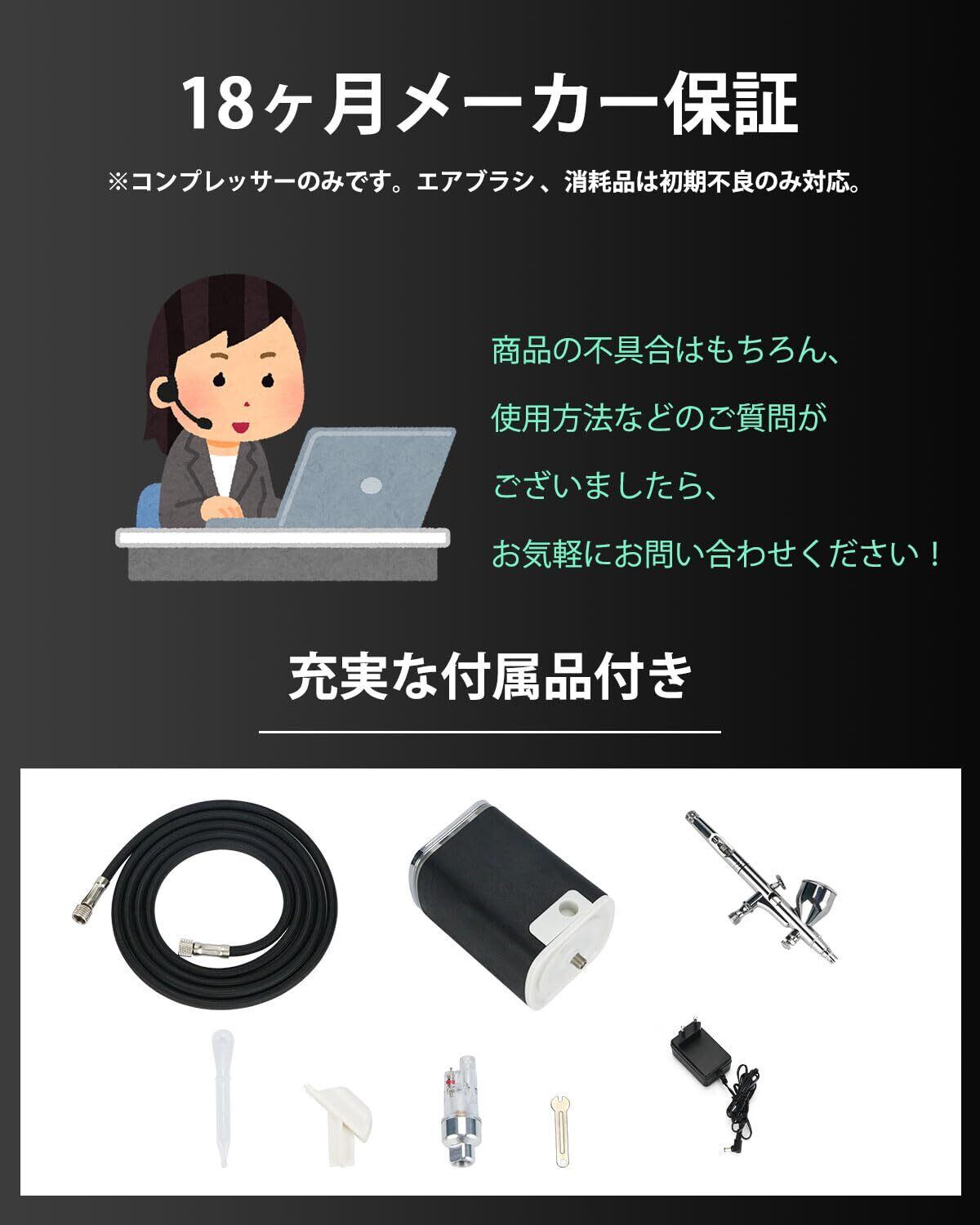 充実のサポート体制:こちらの静音エアブラシには、18ヶ月のメーカー保証が付いています(ハンドピースは消耗品のため初期不良のみ対応)。製品の不具合はもちろん、使用方法などのご質問がございましたら、エアブラシに関する知識豊富なスタッフが丁寧にご対応させていただきます!